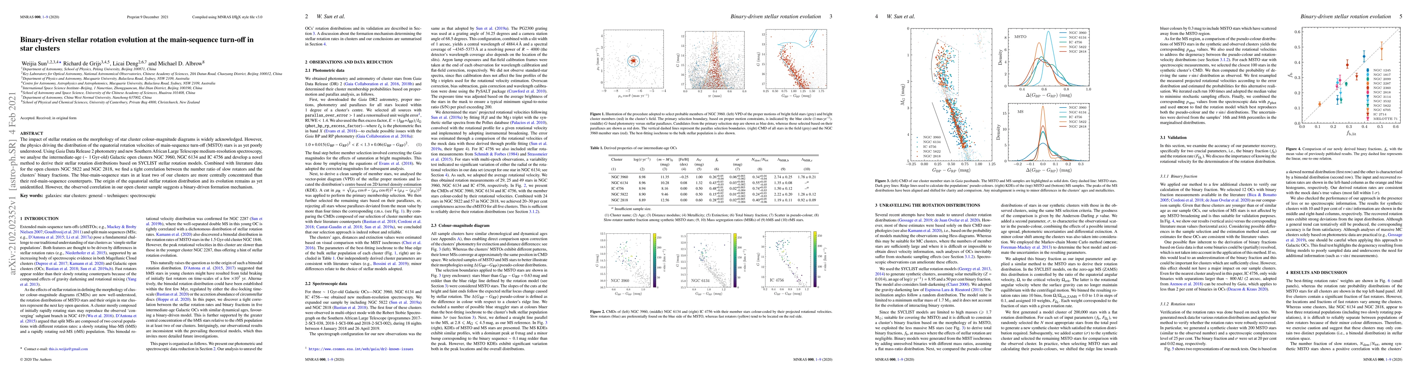 The impact of stellar rotation on the morphology of star cluster colour-magnitude diagrams is widely acknowledged. However, the physics driving the distribution of the equatorial rotation velocities of main-sequence turn-off (MSTO) stars is as yet poorly understood. Using Gaia Data Release 2 photometry and new Southern African Large Telescope medium-resolution spectroscopy, we analyse the intermediate-age ($\sim1\,$Gyr-old) Galactic open clusters NGC 3960, NGC 6134 and IC 4756 and develop a novel method to derive their stellar rotation distributions based on SYCLIST stellar rotation models. Combined with literature data for the open clusters NGC 5822 and NGC 2818, we find a tight correlation between the number ratio of slow rotators and the clusters' binary fractions. The blue-main-sequence stars in at least two of our clusters are more centrally concentrated than their red-main-sequence counterparts. The origin of the equatorial stellar rotation distribution and its evolution remains as yet unidentified. However, the observed correlation in our open cluster sample suggests a binary-driven formation mechanism.