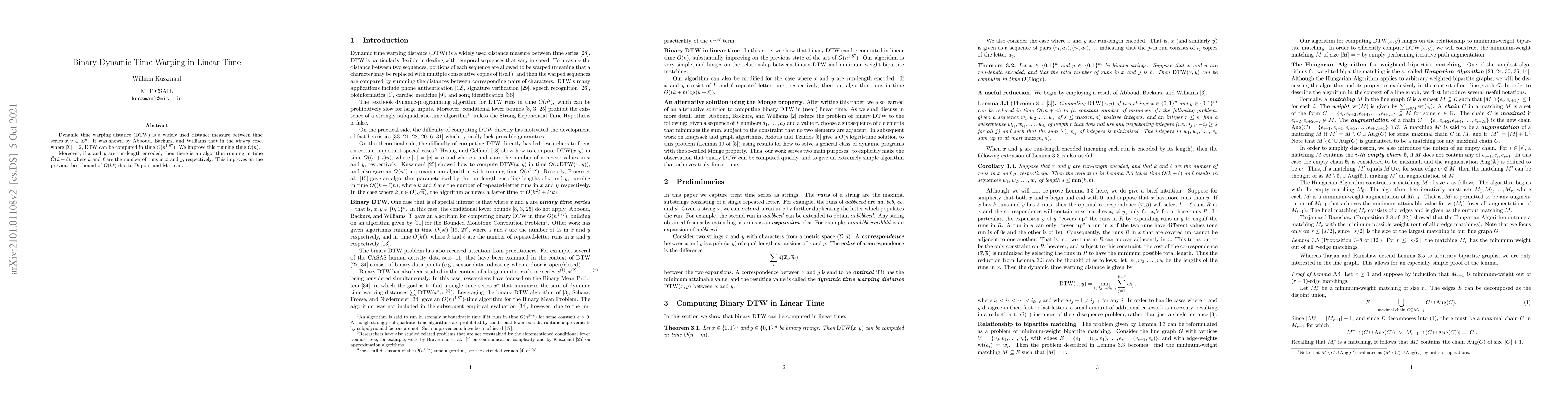 Dynamic time warping distance (DTW) is a widely used distance measure between time series $x, y \in \Sigma^n$. It was shown by Abboud, Backurs, and Williams that in the \emph{binary case}, where $|\Sigma| = 2$, DTW can be computed in time $O(n^{1.87})$. We improve this running time $O(n)$. Moreover, if $x$ and $y$ are run-length encoded, then there is an algorithm running in time $\tilde{O}(k + \ell)$, where $k$ and $\ell$ are the number of runs in $x$ and $y$, respectively. This improves on the previous best bound of $O(k\ell)$ due to Dupont and Marteau.