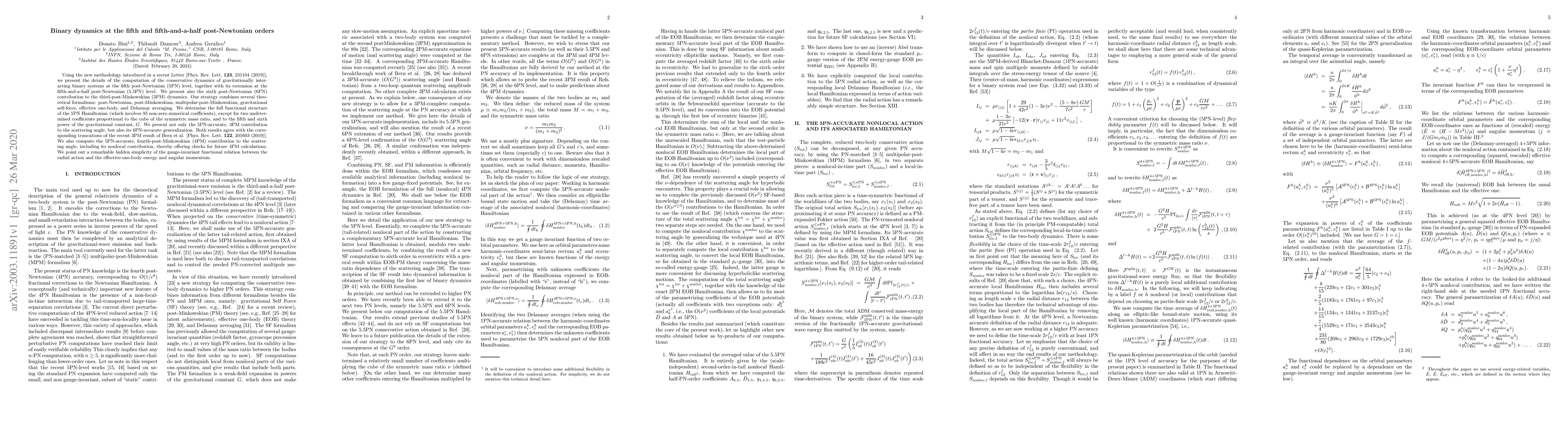 This paper computes the conservative dynamics of gravitationally interacting binary systems to the fifth post-Newtonian (5PN) and fifth-and-a-half post-Newtonian (5.5PN) orders, employing a combination of theoretical formalisms. It determines the full 5PN Hamiltonian structure and presents 5PN-accurate scattering angle contributions, along with 6PN-accurate generalizations.