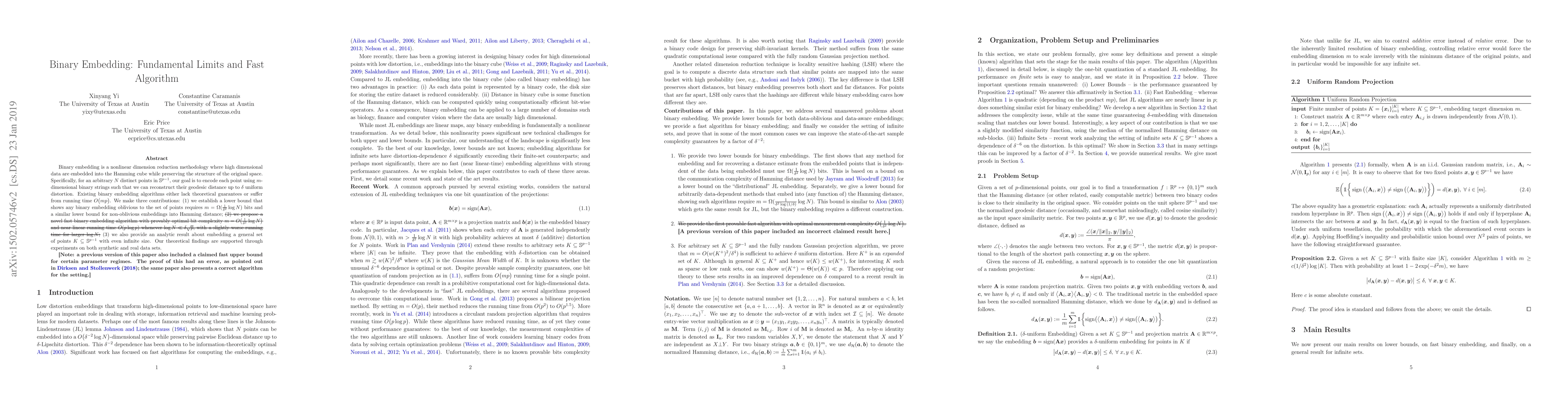 A new method for reducing high-dimensional data into lower dimensions using binary embedding preserves the original space's structure while minimizing distortion. The research establishes fundamental limits and provides a fast algorithm to achieve this reduction.