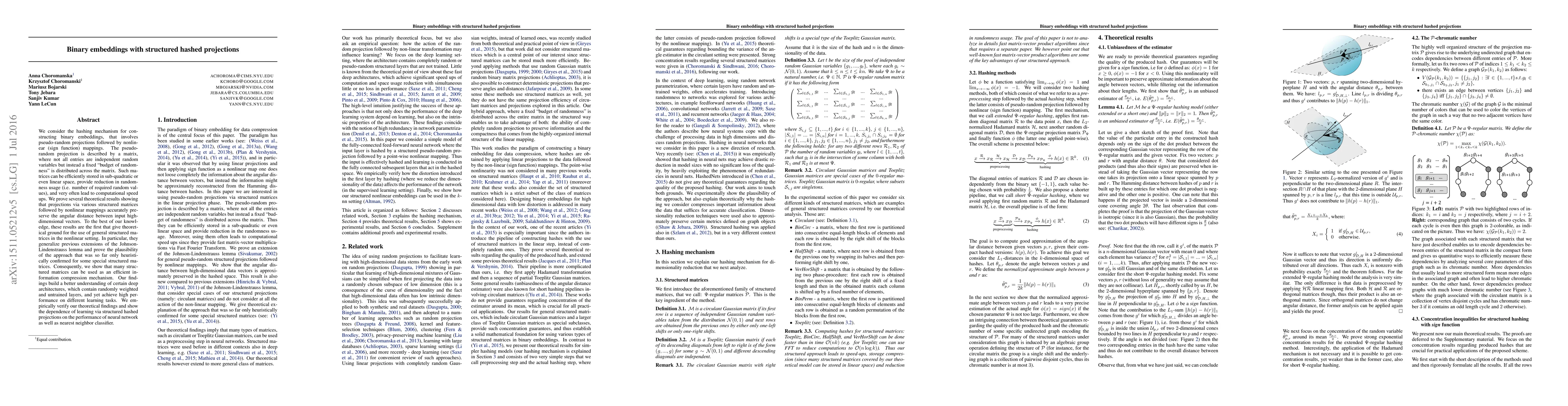 This paper explores the use of structured matrices in hashing mechanisms for constructing binary embeddings, demonstrating that these matrices can be efficiently stored and used to reduce randomness while preserving angular distances between high-dimensional vectors. The authors provide theoretical proofs and empirical validation showing the effectiveness of these structured matrices in neural networks and nearest neighbor classifiers.