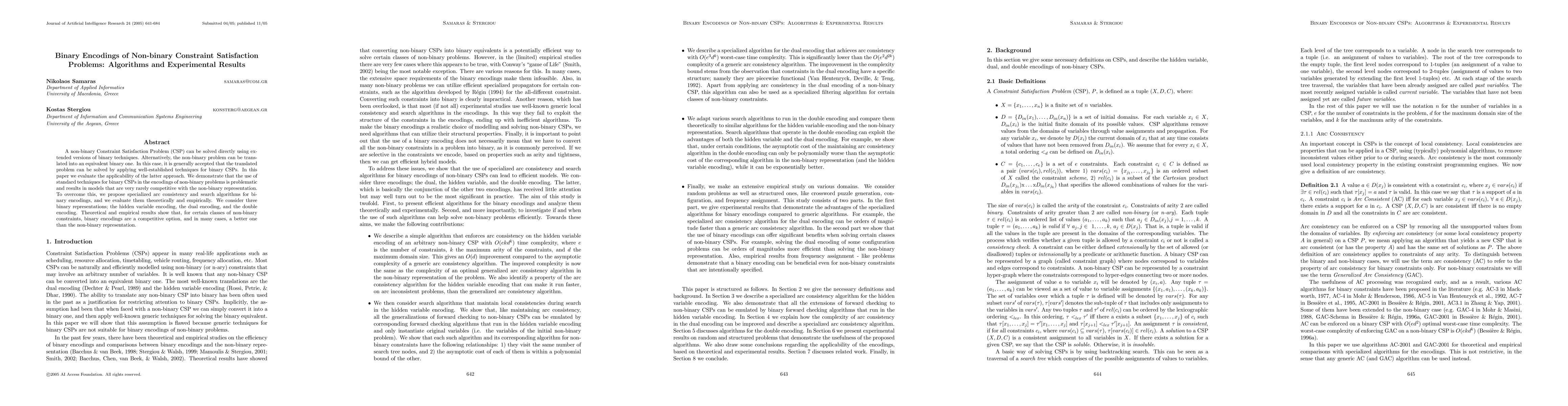 This paper evaluates the translation of non-binary Constraint Satisfaction Problems into binary form using standard techniques, finding them often ineffective. It proposes specialized arc consistency and search algorithms for binary encodings, demonstrating that these can outperform non-binary representations in certain cases.