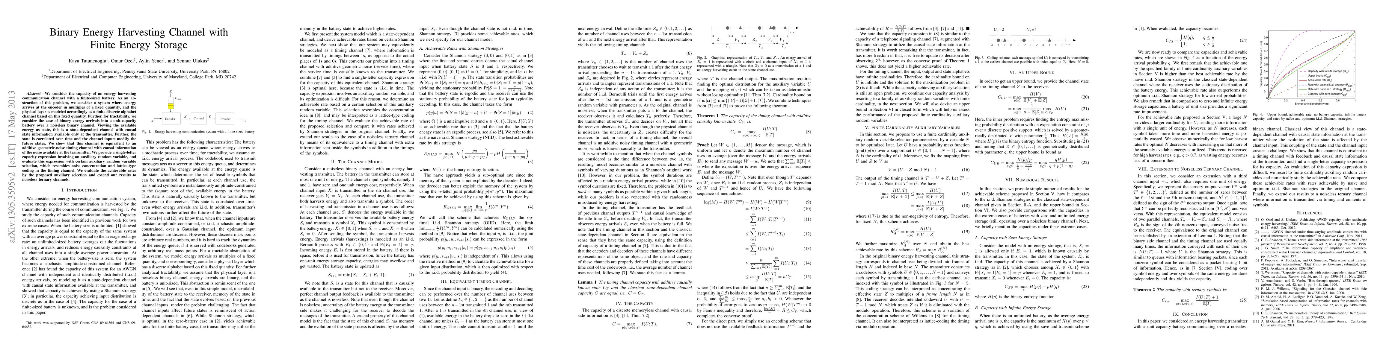 This paper investigates the capacity of an energy harvesting communication channel with a finite-sized battery, modeling energy arrivals as binary quantities. It demonstrates that the channel is equivalent to an additive geometric-noise timing channel, providing a single-letter capacity expression and evaluating achievable rates through auxiliary random variable selection.