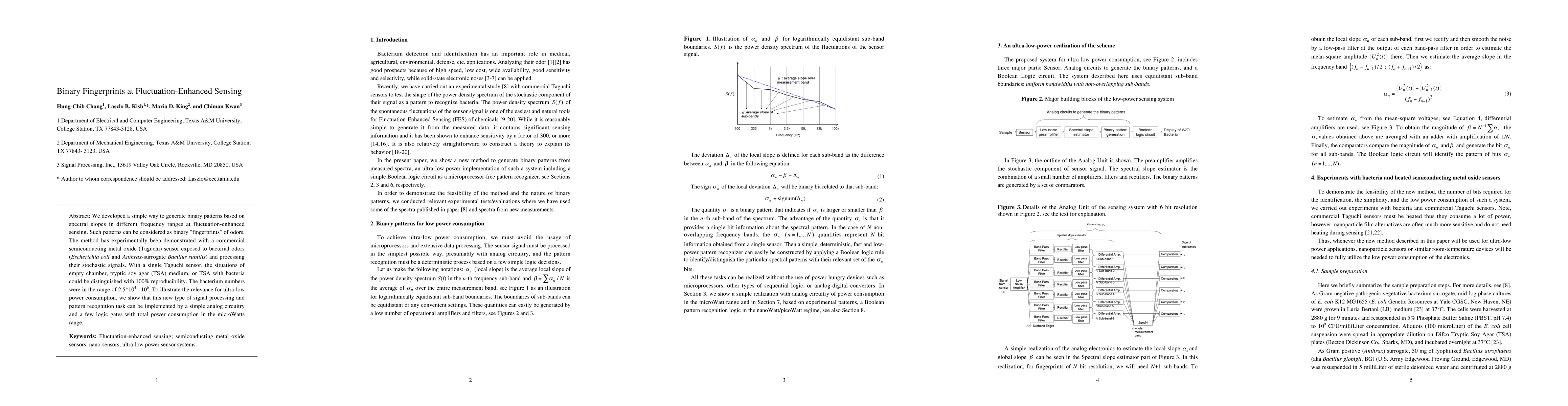 We developed a simple way to generate binary patterns based on spectral slopes in different frequency ranges at fluctuation-enhanced sensing. Such patterns can be considered as binary "fingerprints" of odors. The method has experimentally been demonstrated with a commercial semiconducting metal oxide (Taguchi) sensor exposed to bacterial odors (Escherichia coli and Anthrax-surrogate Bacillus subtilis) and processing their stochastic signals. With a single Taguchi sensor, the situations of empty chamber, tryptic soy agar (TSA) medium, or TSA with bacteria could be distinguished with 100% reproducibility. The bacterium numbers were in the range of 25 thousands to 1 million. To illustrate the relevance for ultra-low power consumption, we show that this new type of signal processing and pattern recognition task can be implemented by a simple analog circuitry and a few logic gates with total power consumption in the microWatts range.