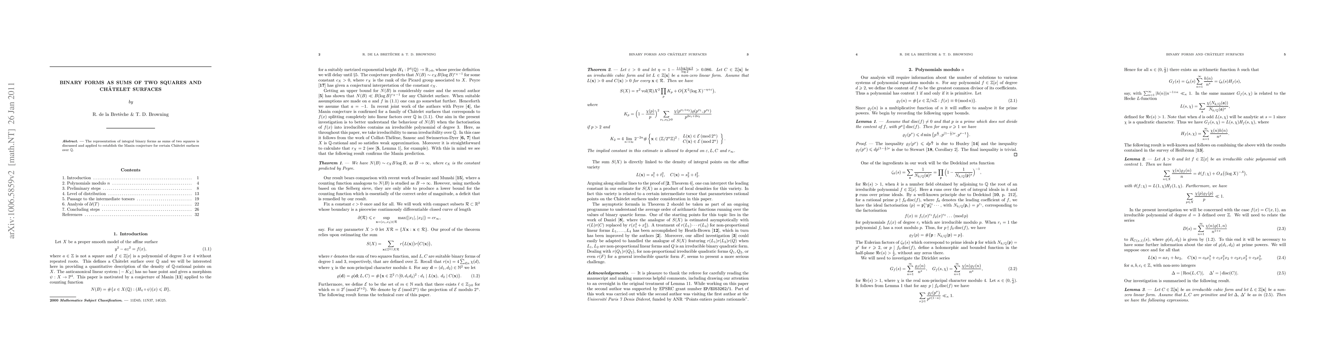 This paper explores how integral binary forms can be expressed as sums of two squares and uses this insight to prove the Manin conjecture for specific Ch\^atelet surfaces over the rationals. The study bridges number theory and algebraic geometry.