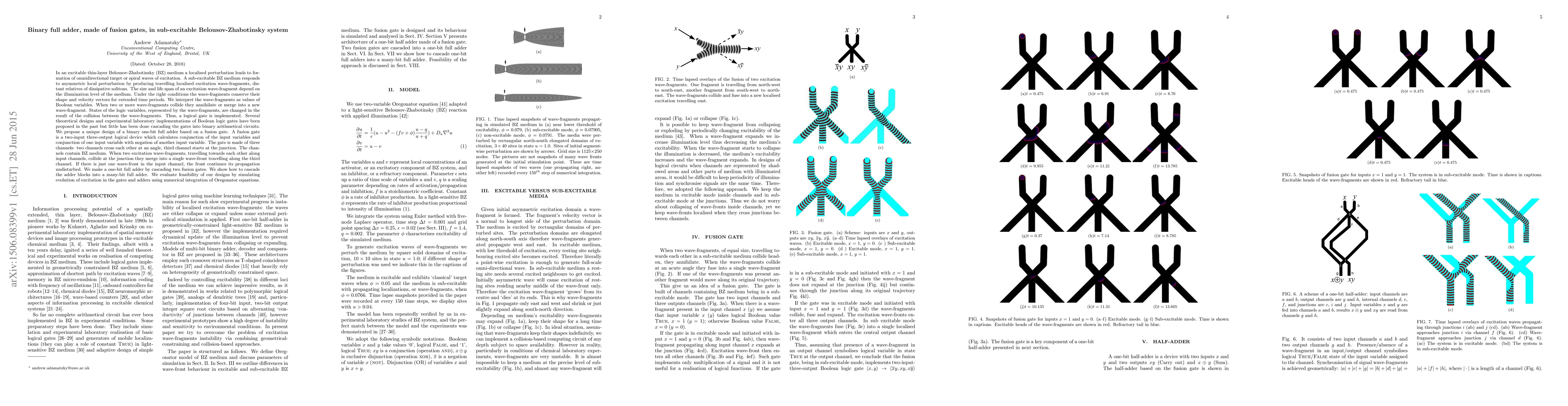 A sub-excitable BZ medium responds to asymmetric local perturbation by producing travelling localised excitation wave-fragments, distant relatives of dissipative solitons. The size and life span of an excitation wave-fragment depend on the illumination level of the medium. Under the right conditions the wave-fragments conserve their shape and velocity vectors for extended time periods. We interpret the wave-fragments as values of Boolean variables. When two or more wave-fragments collide they annihilate or merge into a new wave-fragment. States of the logic variables, represented by the wave-fragments, are changed in the result of the collision between the wave-fragments. Thus, a logical gate is implemented. Several theoretical designs and experimental laboratory implementations of Boolean logic gates have been proposed in the past but little has been done cascading the gates into binary arithmetical circuits. We propose a unique design of a binary one-bit full adder based on a fusion gate. A fusion gate is a two-input three-output logical device which calculates conjunction of the input variables and conjunction of one input variable with negation of another input variable. The gate is made of three channels: two channels cross each other at an angle, third channel starts at the junction. The channels contain BZ medium. When two excitation wave-fragments, travelling towards each other along input channels, collide at the junction they merge into a single wave-front travelling along the third channel. If there is just one wave-front in the input channel, the front continues its propagation undisturbed. We make a one-bit full adder by cascading two fusion gates. We show how to cascade the adder blocks into a many-bit full adder. We evaluate feasibility of our designs by simulating evolution of excitation in the gates and adders using numerical integration of Oregonator equations.