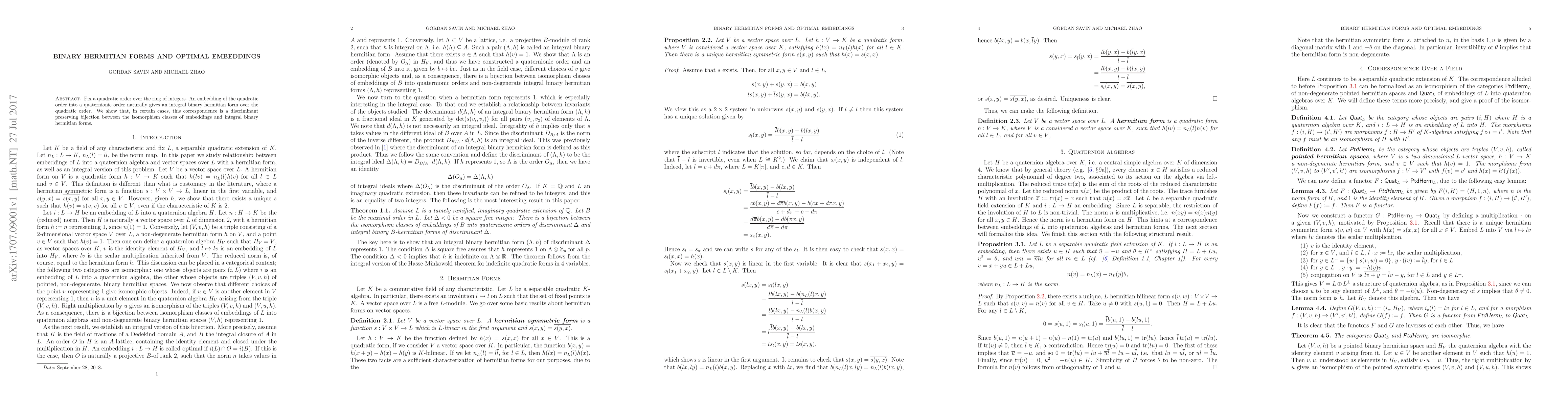 Summary: This paper explores embeddings of quadratic orders into quaternionic orders, establishing a discriminant-preserving bijection between these embeddings and integral binary hermitian forms under specific conditions. The focus is on the structural relationship between these mathematical objects.