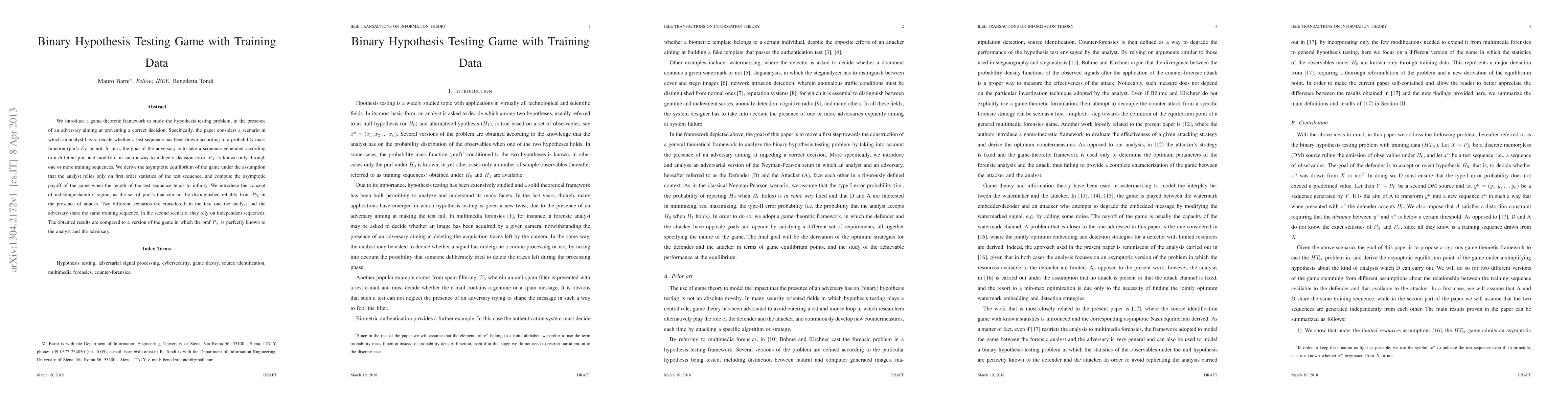 This paper develops a game-theoretic framework for binary hypothesis testing with adversarial interference, analyzing scenarios where an analyst must distinguish test sequences from a known pmf P_X, while an adversary attempts to induce errors. It derives the asymptotic equilibrium and payoffs, introducing the concept of indistinguishability regions, and compares results across shared and independent training sequence scenarios.