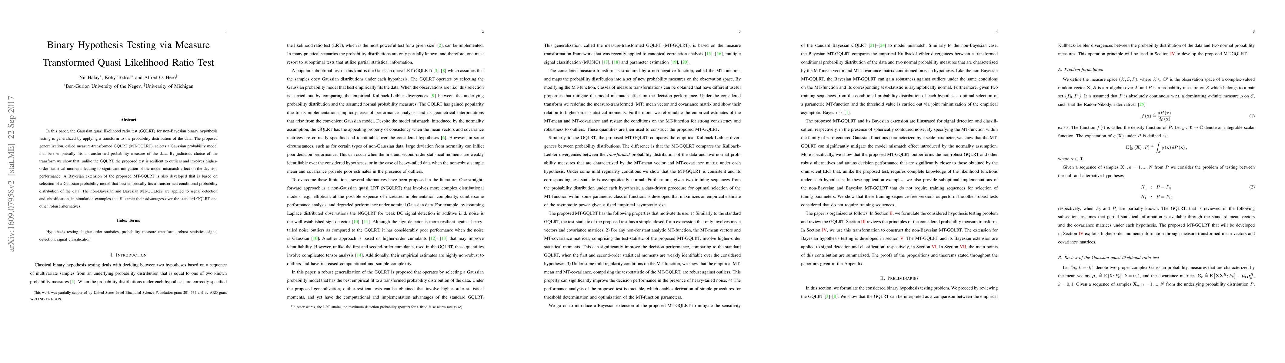 In this paper, the Gaussian quasi likelihood ratio test (GQLRT) for non-Bayesian binary hypothesis testing is generalized by applying a transform to the probability distribution of the data. The proposed generalization, called measure-transformed GQLRT (MT-GQLRT), selects a Gaussian probability model that best empirically fits a transformed probability measure of the data. By judicious choice of the transform we show that, unlike the GQLRT, the proposed test is resilient to outliers and involves higher-order statistical moments leading to significant mitigation of the model mismatch effect on the decision performance. Under some mild regularity conditions we show that the MT-GQLRT is consistent and its corresponding test statistic is asymptotically normal. A data driven procedure for optimal selection of the measure transformation parameters is developed that maximizes an empirical estimate of the asymptotic power given a fixed empirical asymptotic size. A Bayesian extension of the proposed MT-GQLRT is also developed that is based on selection of a Gaussian probability model that best empirically fits a transformed conditional probability distribution of the data. In the Bayesian MT-GQLRT the threshold and the measure transformation parameters are selected via joint minimization of the empirical asymptotic Bayes risk. The non-Bayesian and Bayesian MT-GQLRTs are applied to signal detection and classification, in simulation examples that illustrate their advantages over the standard GQLRT and other robust alternatives.