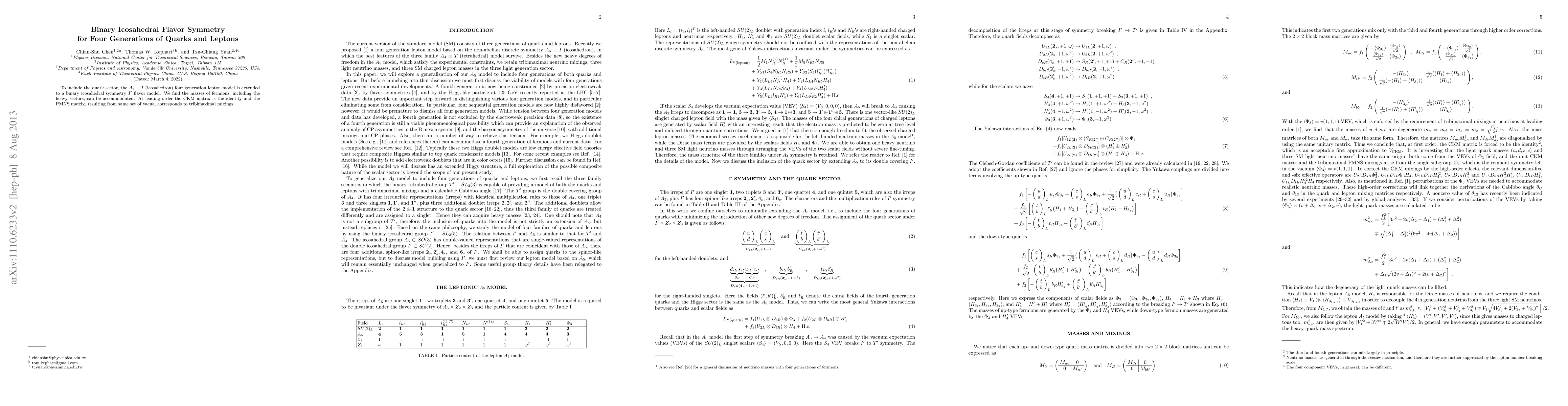 To include the quark sector, the $A_{5}\equiv I$ (icosahedron) four generation lepton model is extended to a binary icosahedral symmetry $I'$ flavor model. We find the masses of fermions, including the heavy sectors, can be accommodated. At leading order the CKM matrix is the identity and the PMNS matrix, resulting from same set of vacua, corresponds to tribimaximal mixings.