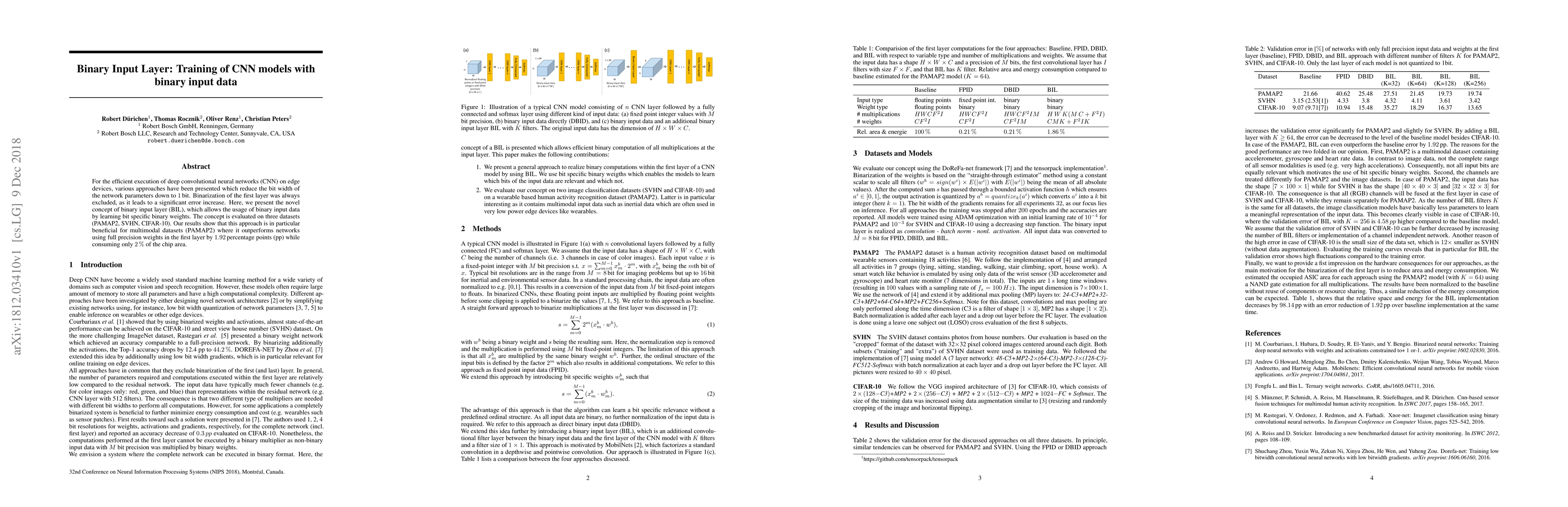 For the efficient execution of deep convolutional neural networks (CNN) on edge devices, various approaches have been presented which reduce the bit width of the network parameters down to 1 bit. Binarization of the first layer was always excluded, as it leads to a significant error increase. Here, we present the novel concept of binary input layer (BIL), which allows the usage of binary input data by learning bit specific binary weights. The concept is evaluated on three datasets (PAMAP2, SVHN, CIFAR-10). Our results show that this approach is in particular beneficial for multimodal datasets (PAMAP2) where it outperforms networks using full precision weights in the first layer by 1:92 percentage points (pp) while consuming only 2 % of the chip area.