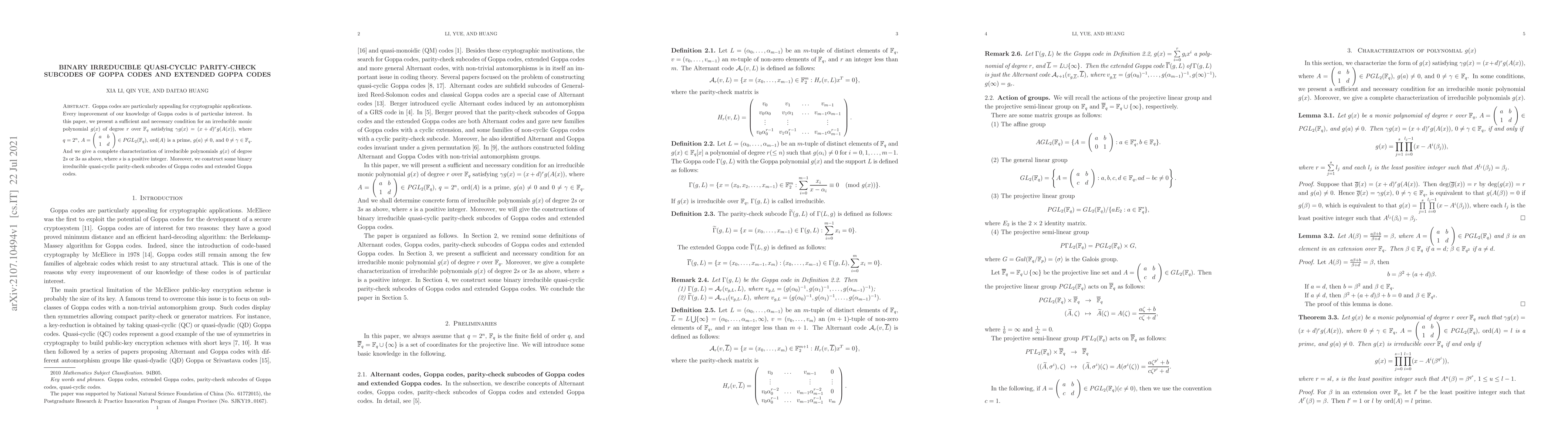 This paper provides a necessary and sufficient condition for irreducible monic polynomials in Goppa codes that satisfy a specific polynomial equation. It also characterizes such polynomials of degrees 2s and 3s and constructs binary irreducible quasi-cyclic parity-check subcodes of Goppa and extended Goppa codes.