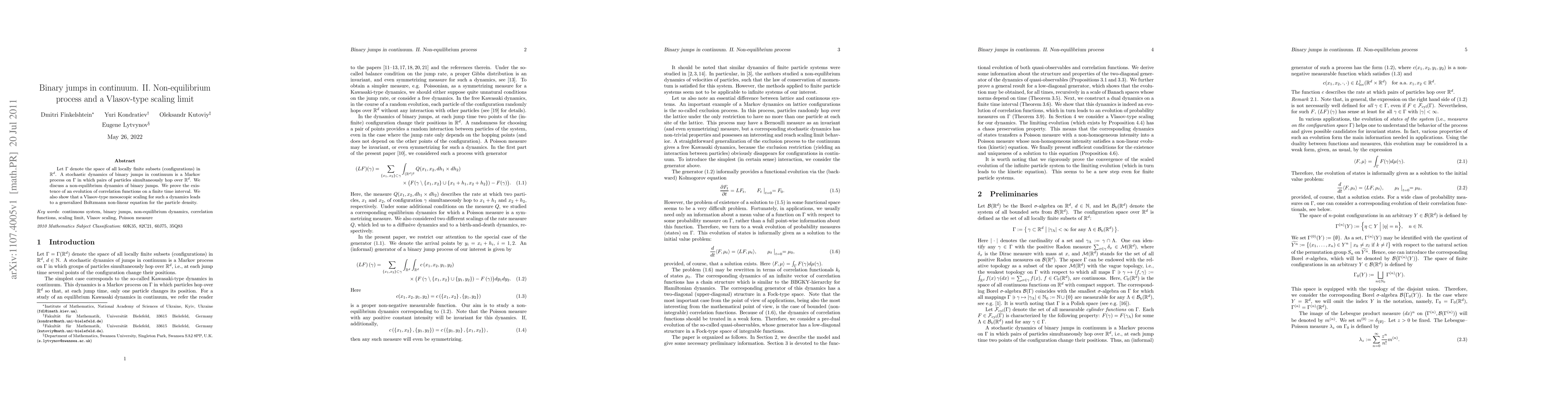 Researchers studied a stochastic dynamics of binary jumps in continuum, proving its non-equilibrium dynamics and deriving a generalized Boltzmann equation for particle density through a Vlasov-type mesoscopic scaling.