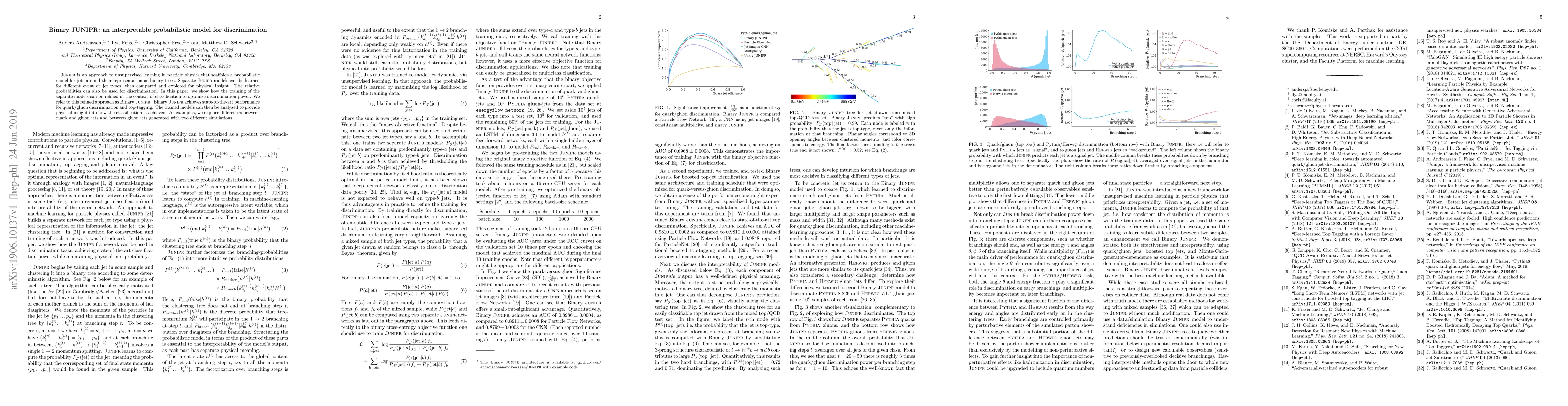 JUNIPR is an approach to unsupervised learning in particle physics that scaffolds a probabilistic model for jets around their representation as binary trees. Separate JUNIPR models can be learned for different event or jet types, then compared and explored for physical insight. The relative probabilities can also be used for discrimination. In this paper, we show how the training of the separate models can be refined in the context of classification to optimize discrimination power. We refer to this refined approach as Binary JUNIPR. Binary JUNIPR achieves state-of-the-art performance for quark/gluon discrimination and top-tagging. The trained models can then be analyzed to provide physical insight into how the classification is achieved. As examples, we explore differences between quark and gluon jets and between gluon jets generated with two different simulations.
