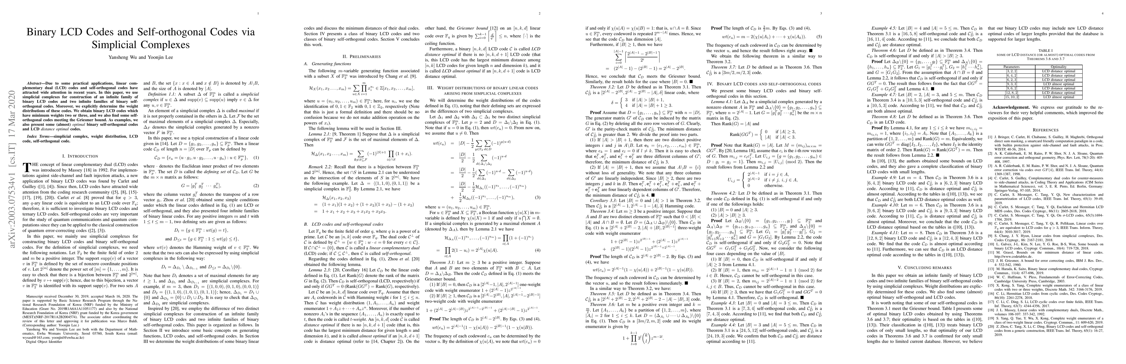 This paper constructs binary LCD and self-orthogonal codes using simplicial complexes, determining their weight distributions and showcasing optimal examples, including codes meeting the Griesmer bound. The work reveals an infinite family of LCD codes with minimum weights of two or three and two infinite families of self-orthogonal codes.