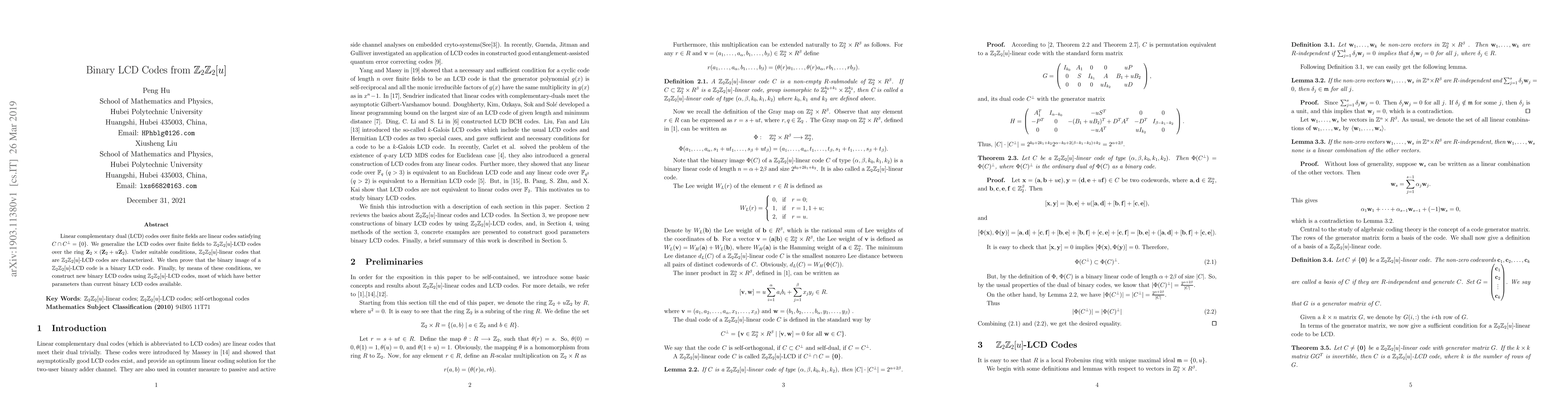 This paper generalizes linear complementary dual (LCD) codes over finite fields to $\mathbb{Z}_2\mathbb{Z}_2[u]$-LCD codes over the ring $\mathbb{Z}_2\times(\mathbb{Z}_2+u\mathbb{Z}_2)$, characterizes $\mathbb{Z}_2\mathbb{Z}_2[u]$-LCD codes under certain conditions, and constructs new binary LCD codes with better parameters.