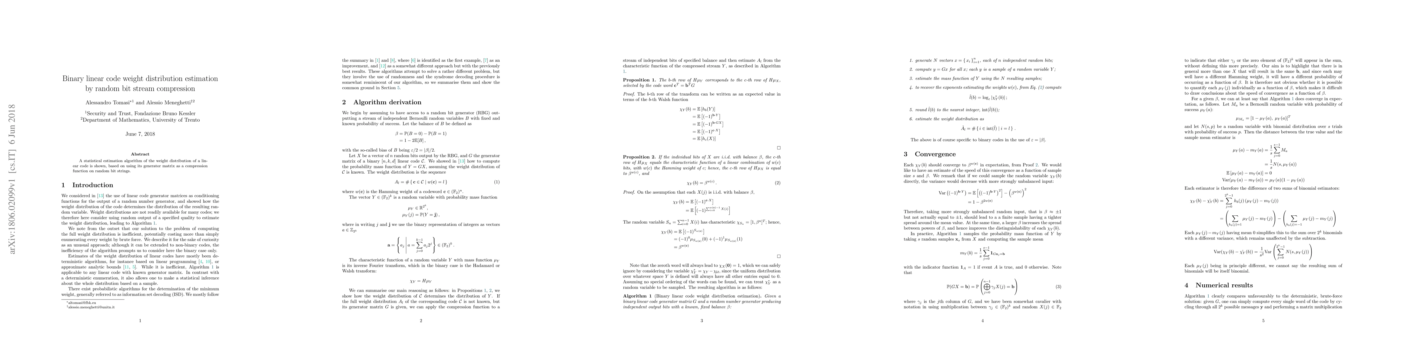 A statistical estimation algorithm of the weight distribution of a linear code is shown, based on using its generator matrix as a compression function on random bit strings.