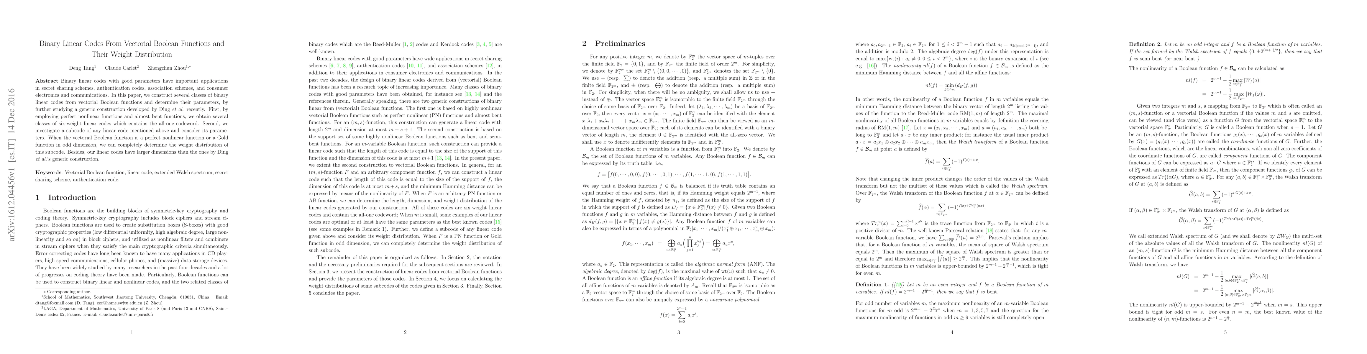 This paper constructs binary linear codes from vectorial Boolean functions, focusing on perfect nonlinear and almost bent functions to derive six-weight codes. The study also determines the weight distribution of subcodes when the functions are perfect nonlinear or Gold functions, and finds these codes have larger dimensions compared to existing constructions.