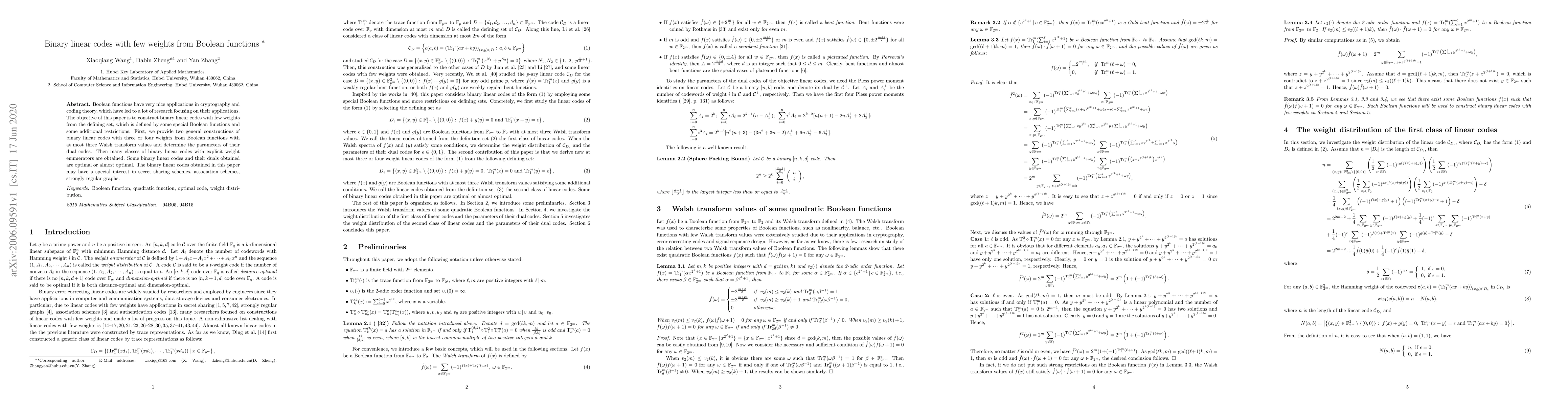 This paper constructs binary linear codes with few weights from Boolean functions, focusing on those with at most three Walsh transform values. It presents two general constructions yielding codes with three or four weights, determining their dual code parameters and identifying optimal or near-optimal codes for applications in secret sharing, association schemes, and strongly regular graphs.
