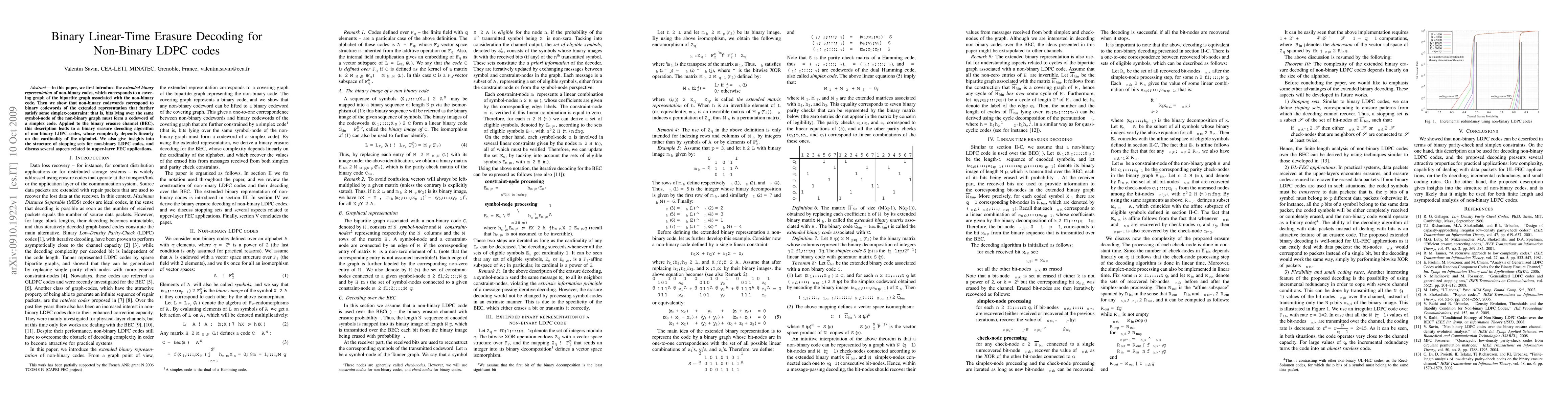 This paper proposes a binary linear-time erasure decoding algorithm for non-binary LDPC codes, utilizing an extended binary representation that satisfies a simplex-constraint, and provides insights into stopping sets and applications for upper-layer forward error correction.