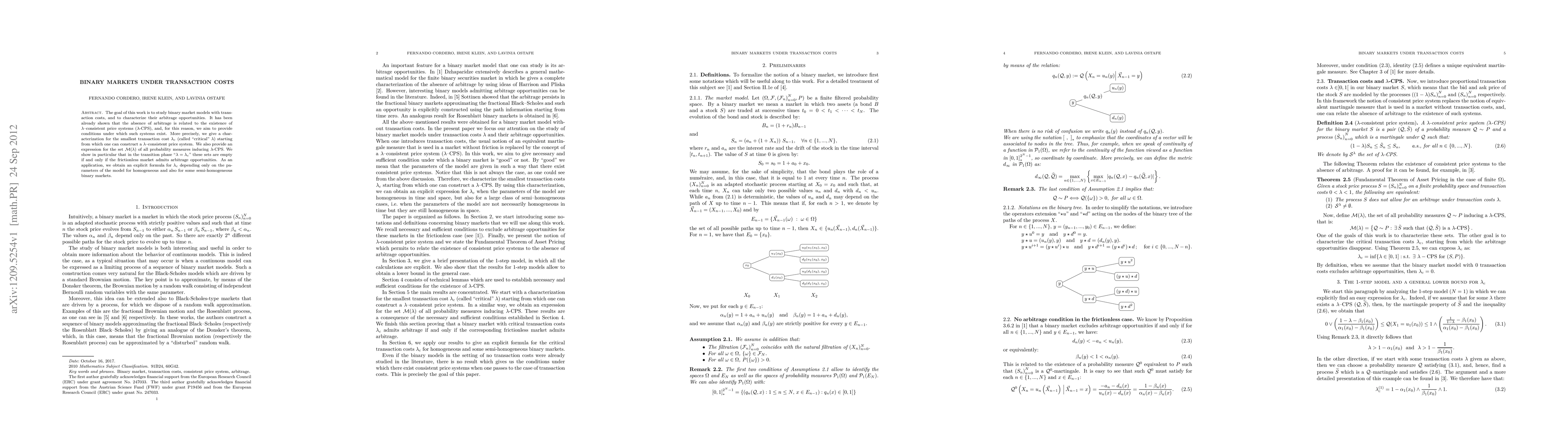This paper investigates binary market models with transaction costs, focusing on the conditions for the existence of arbitrage-free \lambda-consistent price systems. It provides a critical transaction cost \lambda_c that enables the construction of such systems and characterizes the set M(\lambda) of probability measures inducing \lambda-CPS, revealing that at the critical phase, empty sets correspond to the presence of arbitrage in frictionless markets.