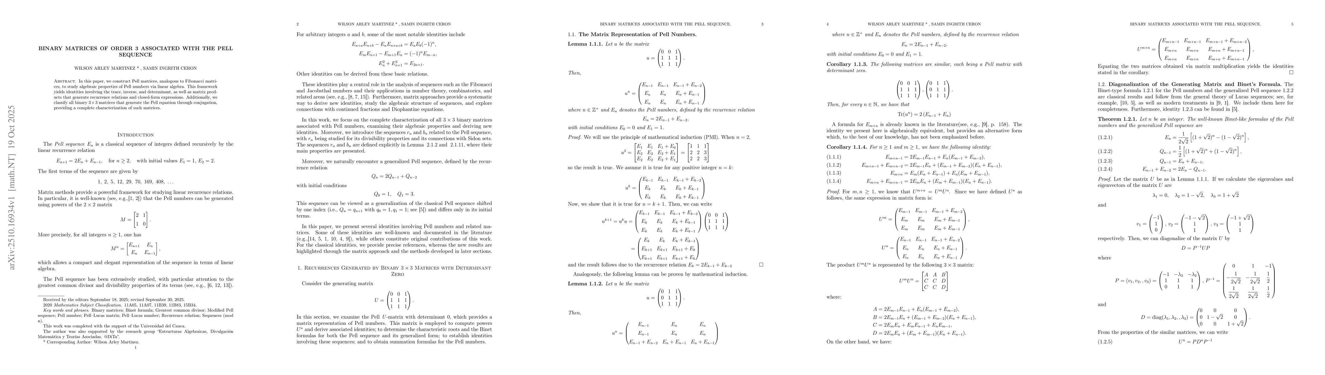 The research employs a combination of algebraic techniques, matrix theory, and number theory to analyze the properties of the Pell sequence and its associated binary matrices. It involves deriving recurrence relations, exploring divisibility properties, and classifying binary matrices under conjugation.