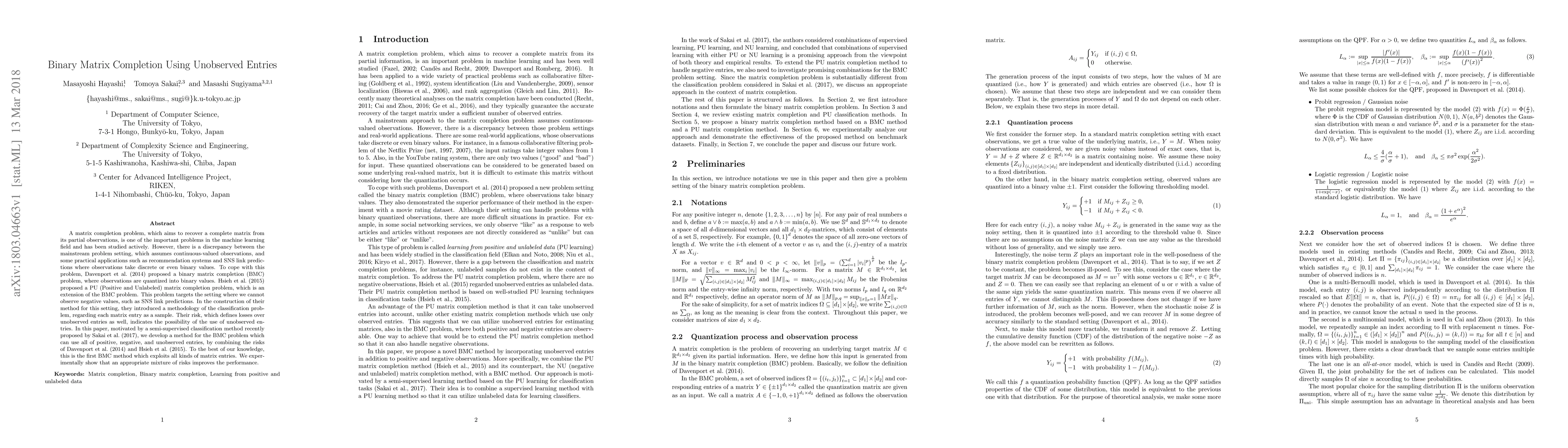 This paper proposes a novel binary matrix completion method that leverages positive, negative, and unobserved entries, combining prior approaches by Davenport et al. and Hsieh et al. Experimental results demonstrate improved performance through this integrated risk-based methodology.