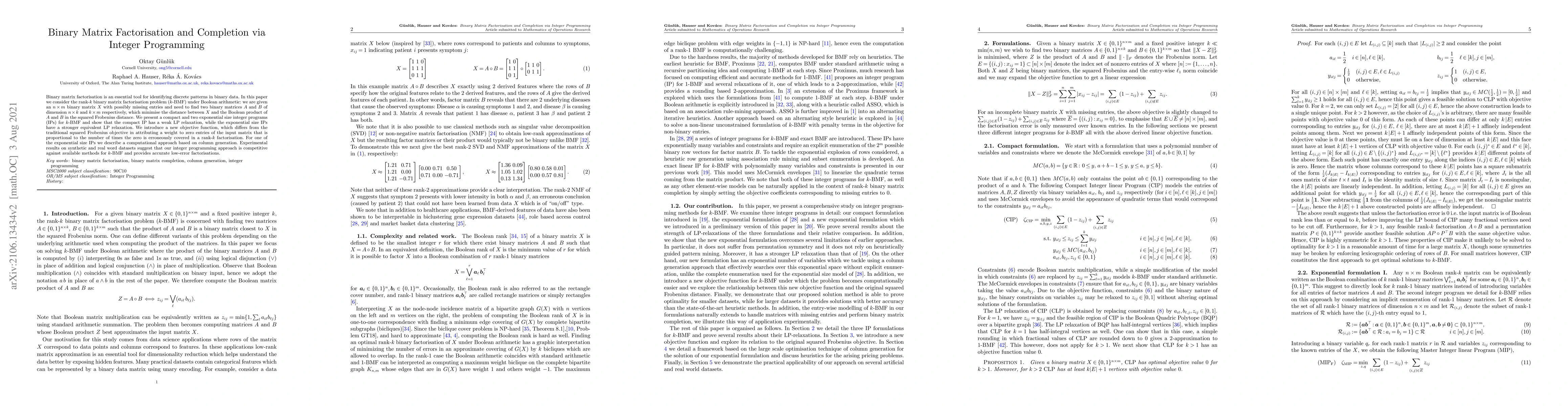 This paper presents integer programming formulations for the rank-k binary matrix factorisation problem, introducing a new objective function that weights zero entries based on errors. Experimental results show that the proposed approach is competitive with existing methods, providing accurate low-error factorisations.