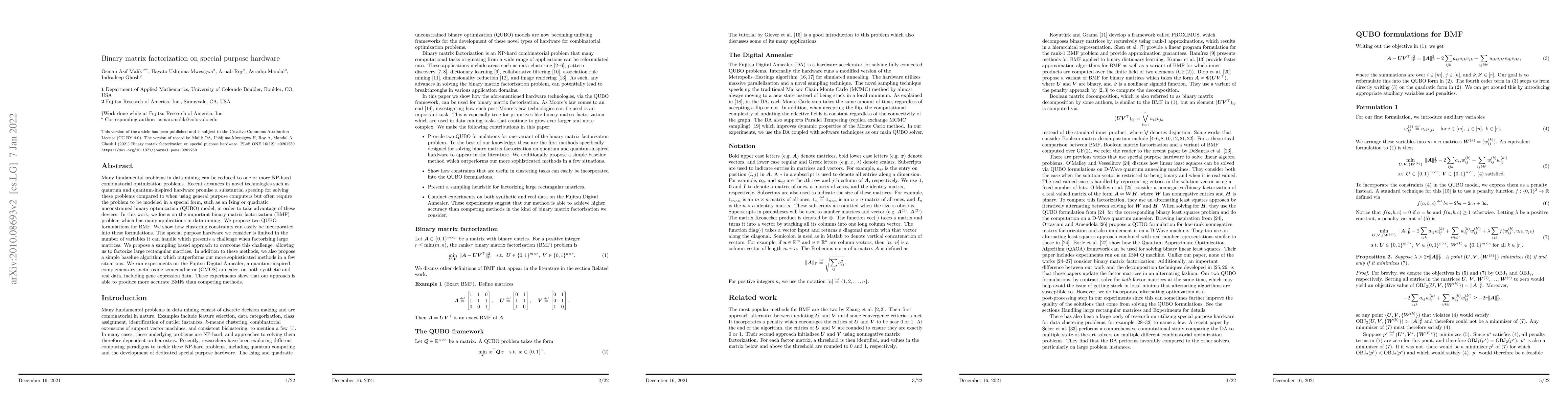 Researchers propose two new methods for solving binary matrix factorization on special purpose hardware like quantum-inspired computers, achieving accurate results with limited variables.
