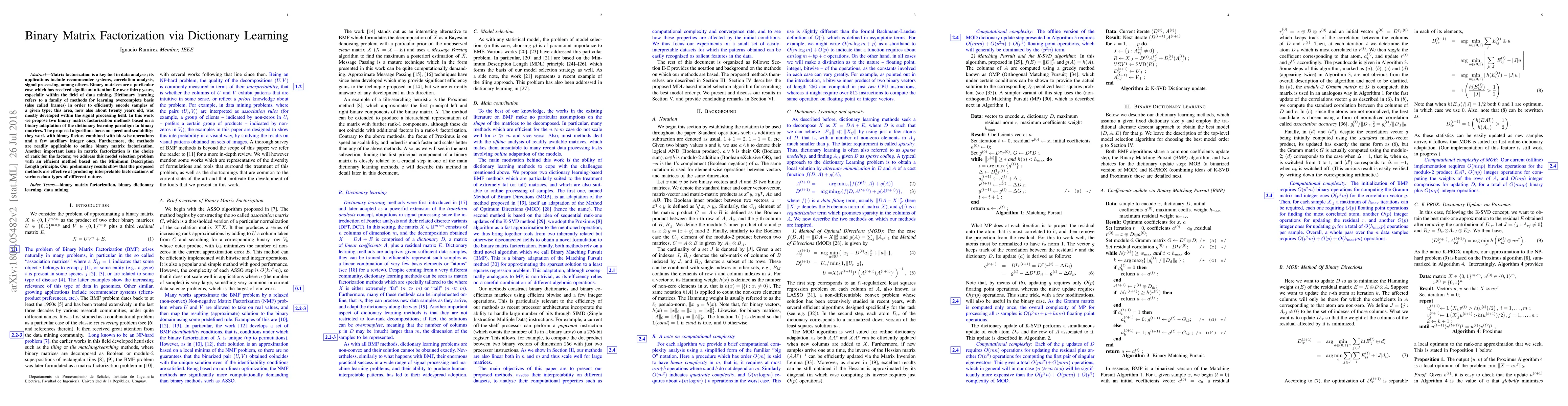 Researchers propose two binary matrix factorization methods based on dictionary learning for efficient encoding of data, with a focus on speed and scalability. The methods also address model selection and are suitable for online processing.
