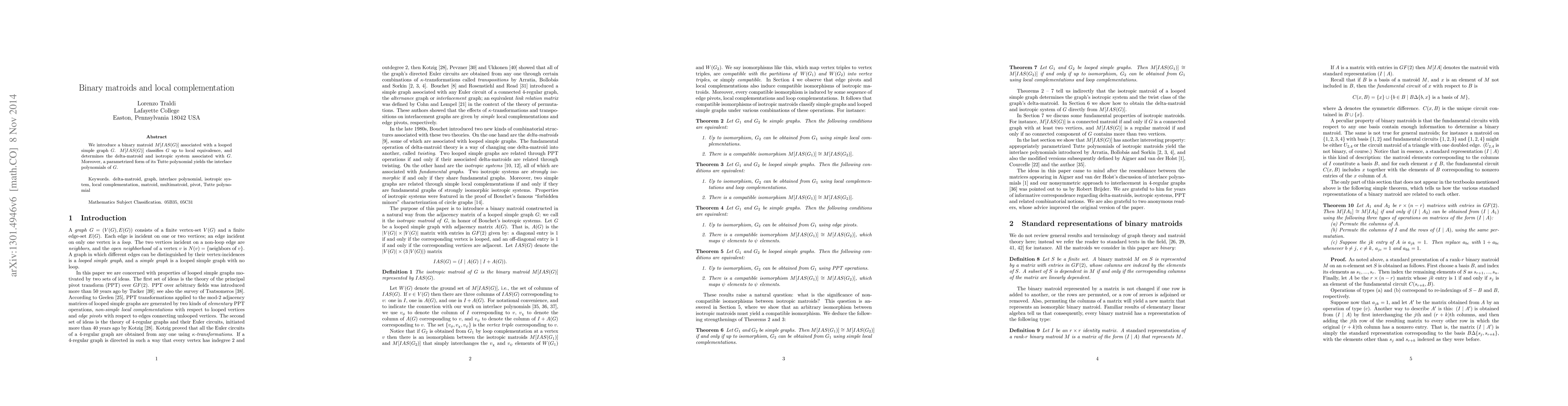 The paper introduces a binary matroid M(IAS(G)) associated with a looped simple graph G, which classifies G up to local equivalence, determines the delta-matroid and isotropic system associated with G, and provides a parametrized form of its Tutte polynomial yielding interlace polynomials of G.