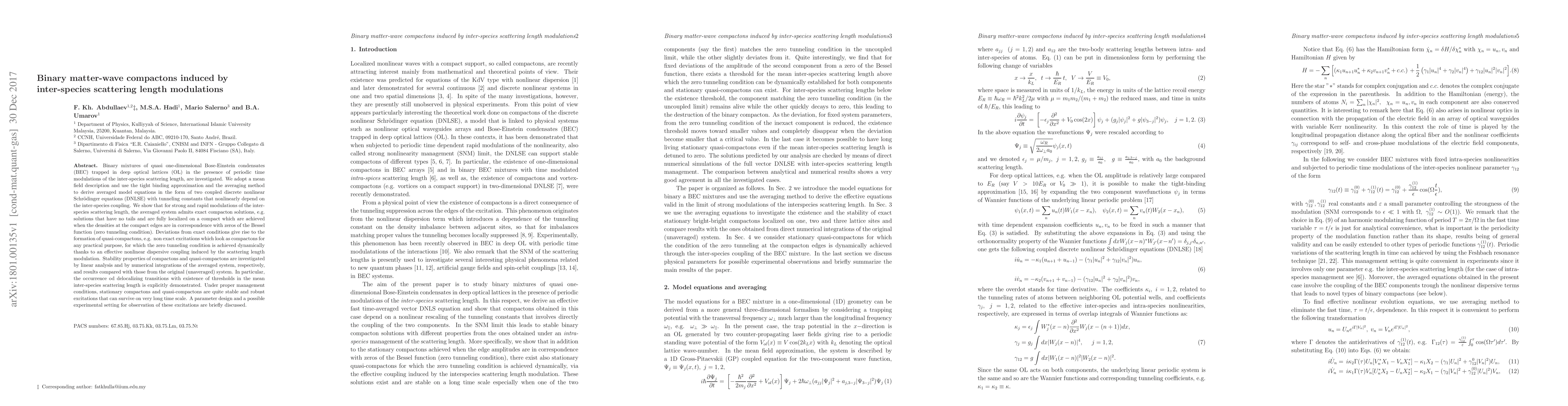 Binary mixtures of quasi one-dimensional Bose-Einstein condensates (BEC) trapped in deep optical lattices (OL) in the presence of periodic time modulations of the inter-species scattering length, are investigated. We adopt a mean field description and use the tight binding approximation and the averaging method to derive averaged model equations in the form of two coupled discrete nonlinear Schr\"odinger equations (DNLSE) with tunneling constants that nonlinearly depend on the inter-species coupling. We show that for strong and rapid modulations of the inter-species scattering length, the averaged system admits exact compacton solutions, e.g. solutions that have no tails and are fully localized on a compact which are achieved when the densities at the compact edges are in correspondence with zeros of the Bessel function (zero tunneling condition). Deviations from exact conditions give rise to the formation of quasi-compactons, e.g. non exact excitations which look as compactons for any practical purpose, for which the zero tunneling condition is achieved dynamically thanks to an effective nonlinear dispersive coupling induced by the scattering length modulation. Stability properties of compactons and quasi-compactons are investigated by linear analysis and by numerical integrations of the averaged system, respectively, and results compared with those from the original (unaveraged) system. In particular, the occurrence od delocalizing transitions with existence of thresholds in the mean inter-species scattering length is explicitly demonstrated. Under proper management conditions, stationary compactons and quasi-compactons are quite stable and robust excitations that can survive on very long time scale. A parameter design and a possible experimental setting for observation of these excitations are briefly discussed.