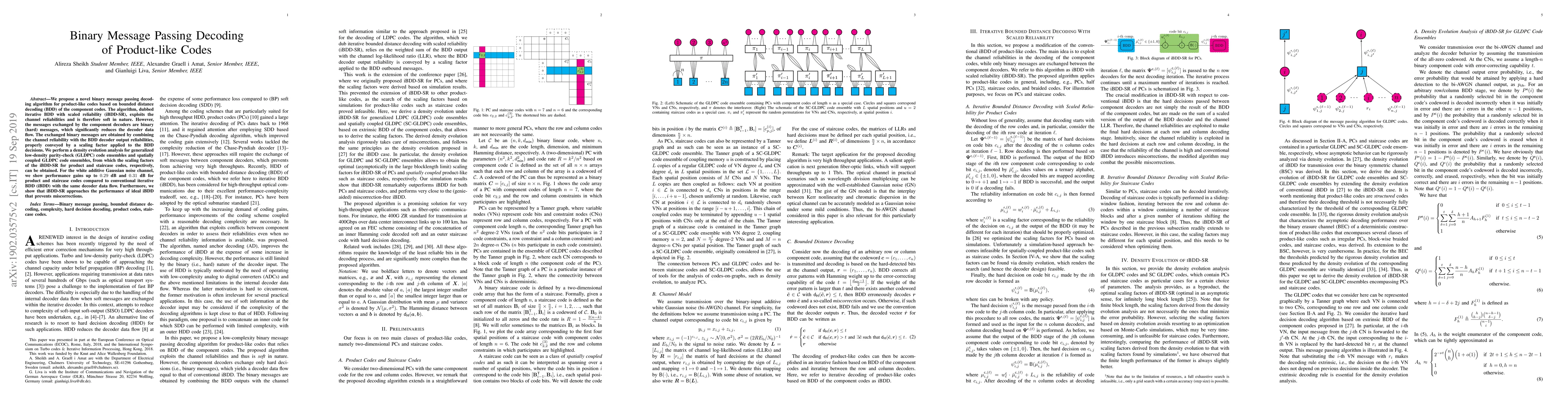 This paper introduces a new binary message passing decoding algorithm, iBDD-SR, for product-like codes that combines bounded distance decoding with scaled reliabilities, achieving performance gains up to 0.31 dB over conventional iterative BDD while reducing decoder data flow through binary message exchanges.