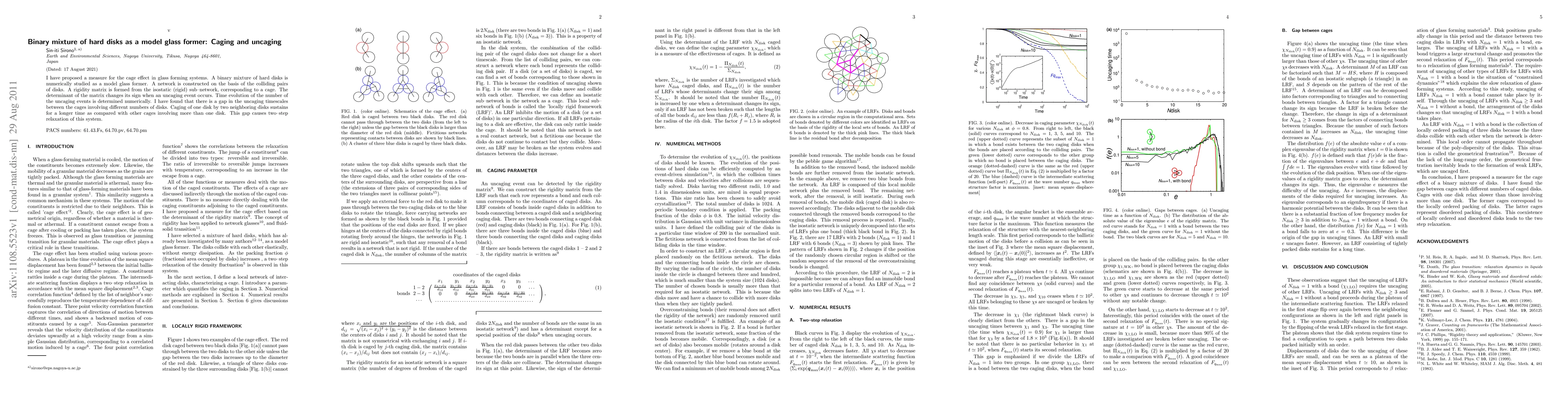 I have proposed a measure for the cage effect in glass forming systems. A binary mixture of hard disks is numerically studied as a model glass former. A network is constructed on the basis of the colliding pairs of disks. A rigidity matrix is formed from the isostatic (rigid) sub--network, corresponding to a cage. The determinant of the matrix changes its sign when an uncaging event occurs. Time evolution of the number of the uncaging events is determined numerically. I have found that there is a gap in the uncaging timescales between the cages involving different numbers of disks. Caging of one disk by two neighboring disks sustains for a longer time as compared with other cages involving more than one disk. This gap causes two--step relaxation of this system.