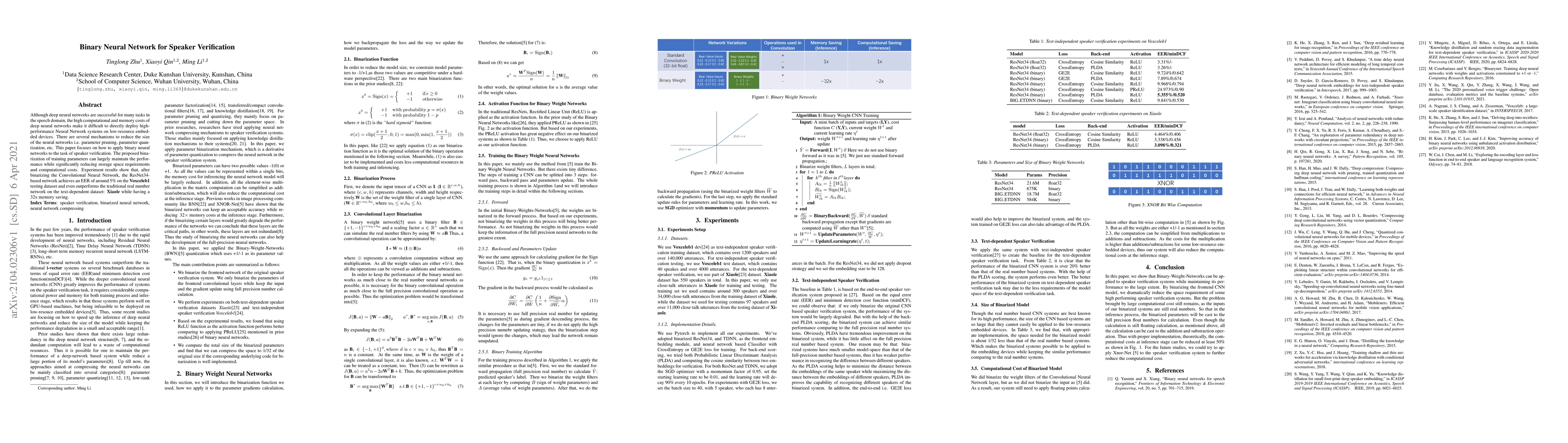 This paper proposes a binary neural network approach for speaker verification to address the high computational and memory costs of traditional deep neural networks. The results show that the binarized ResNet34-based network achieves an EER of around 5% on Voxceleb1 and outperforms traditional networks on text-dependent datasets, while saving 32x in memory.