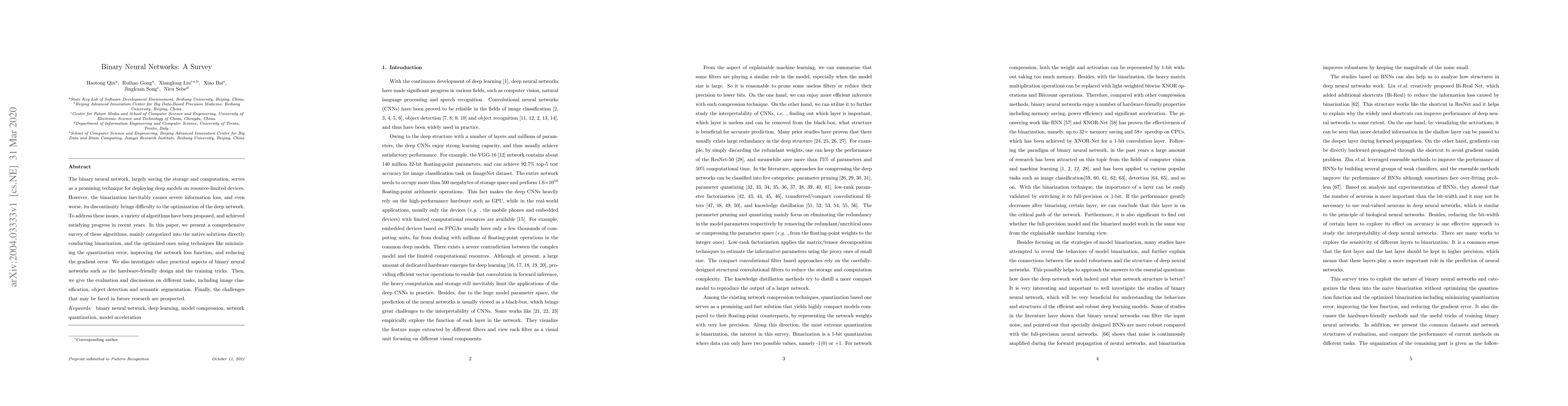 A comprehensive survey of algorithms for binary neural networks addresses issues of information loss and optimization, exploring hardware-friendly design and training tricks for image classification, object detection, and semantic segmentation tasks.