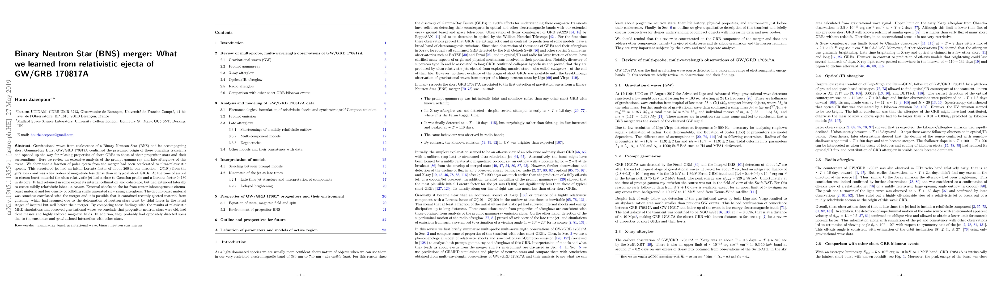 Gravitational waves from coalescence of a Binary Neutron Star (BNS) and its accompagning short Gamma-Ray Burst GW/GRB~170817A confirmed the presumed origin of these puzzeling transients and opened up the way for relating properties of short GRBs to those of their progenitor stars and their surroundings. Here we review an extensive analysis of the prompt gamma-ray and late afterglows of this event. We show that a fraction of polar ejecta from the merger had been accelerated to ultra-relativistic speeds. This structured jet had an initial Lorentz factor of about $260$ in our direction - $\mathcal{O}(10^\circ)$ from the jet's axis - and was a few orders of magnitude less dense than in typical short GRBs. At the time of arrival to circum-burst material the ultra-relativistic jet had a close to Gaussian profile and a Lorentz factor $\gtrsim 130$ in its core. It had retained in some extent its internal collimation and coherence, but had extended laterally to create mildly relativistic lobes - a {\it cocoon}. External shocks on the far from center inhomogeneous circum-burst material and low density of colliding shells generated slow rising afterglows. The circum-burst material was somehow correlated with the merger and it is possible that it contained recently ejected material from glitching, which had resumed due to the deformation of neutron stars crust by tidal forces in the latest stages of inspiral but well before their merger. By comparing these findings with the results of relativistic MHD simulations and observed gravitational waves we conclude that progenitor neutron stars were old, had close masses and highly reduced magnetic fields. In addition, they probably had oppositely directed spins due to the encounter and gravitational interaction with other stars.