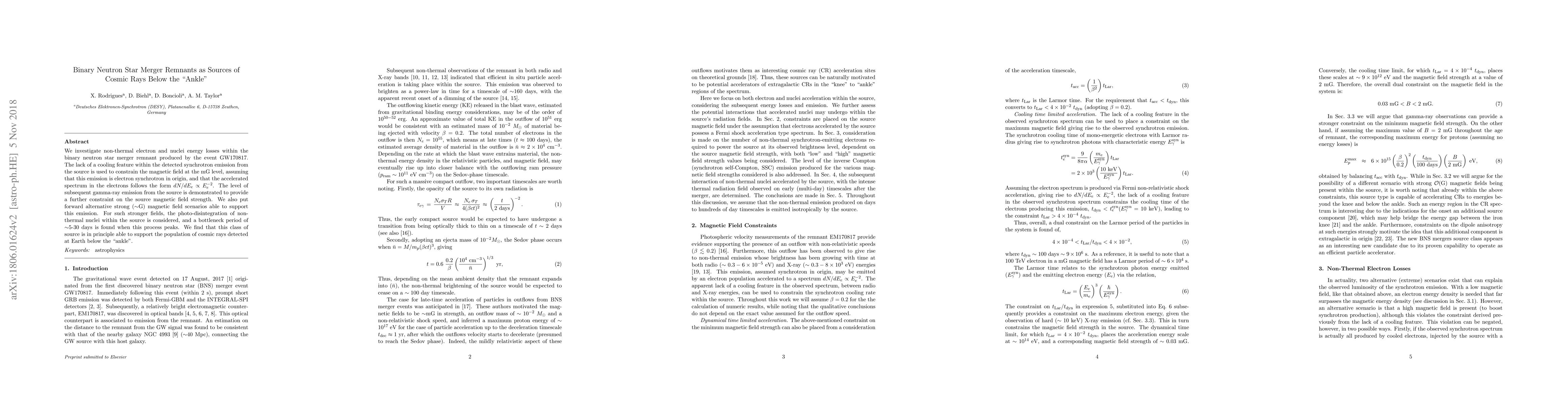 We investigate non-thermal electron and nuclei energy losses within the binary neutron star merger remnant produced by the event GW170817. The lack of a cooling feature within the detected synchrotron emission from the source is used to constrain the magnetic field at the mG level, assuming that this emission is electron synchrotron in origin, and that the accelerated spectrum in the electrons follows the form $dN/dE_e \propto E_e^{-2}$. The level of subsequent gamma-ray emission from the source is demonstrated to provide a further constraint on the source magnetic field strength. We also put forward alternative strong ($\sim$G) magnetic field scenarios able to support this emission. For such stronger fields, the photo-disintegration of non-thermal nuclei within the source is considered, and a bottleneck period of $\sim$5-30 days is found when this process peaks. We find that this class of source is in principle able to support the population of cosmic rays detected at Earth below the "ankle".