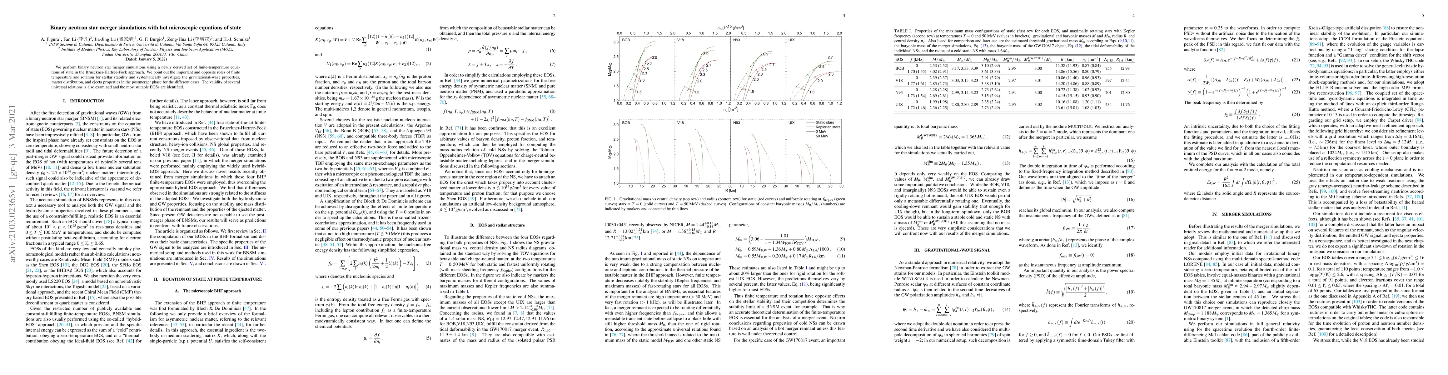 This paper simulates binary neutron star mergers using hot microscopic equations of state derived from the Brueckner-Hartree-Fock approach, examining the effects of finite temperature and rotation on stellar stability, and analyzing gravitational-wave properties, matter distribution, and ejecta in the postmerger phase to identify the most suitable equations of state.