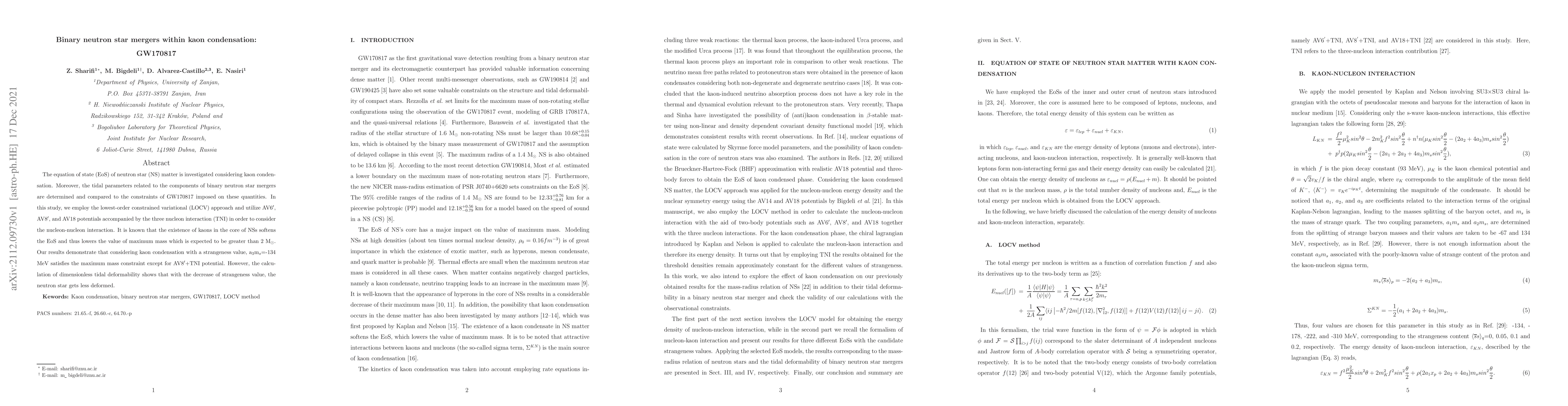 This paper investigates the equation of state of neutron star matter with kaon condensation and determines tidal parameters for binary neutron star mergers, comparing them to GW170817 constraints. Results show that kaon condensation lowers the maximum neutron star mass, with a$_{3}$m$_s$=-134 MeV satisfying the mass constraint, while lower strangeness values lead to less deformation.