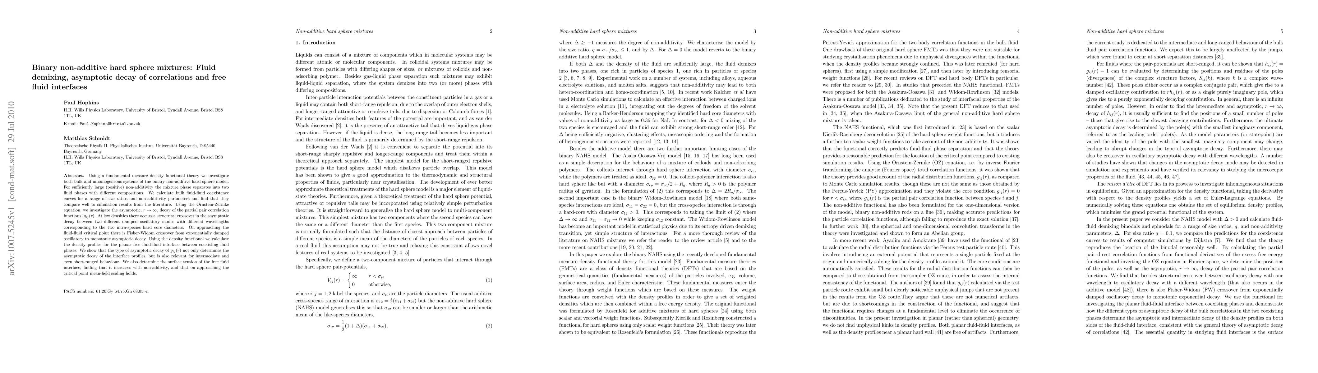 This paper uses density functional theory to study binary non-additive hard sphere mixtures, examining fluid demixing, the asymptotic decay of correlations, and free fluid interfaces, finding good agreement with simulation results and identifying the influence of non-additivity on phase separation and interface properties.