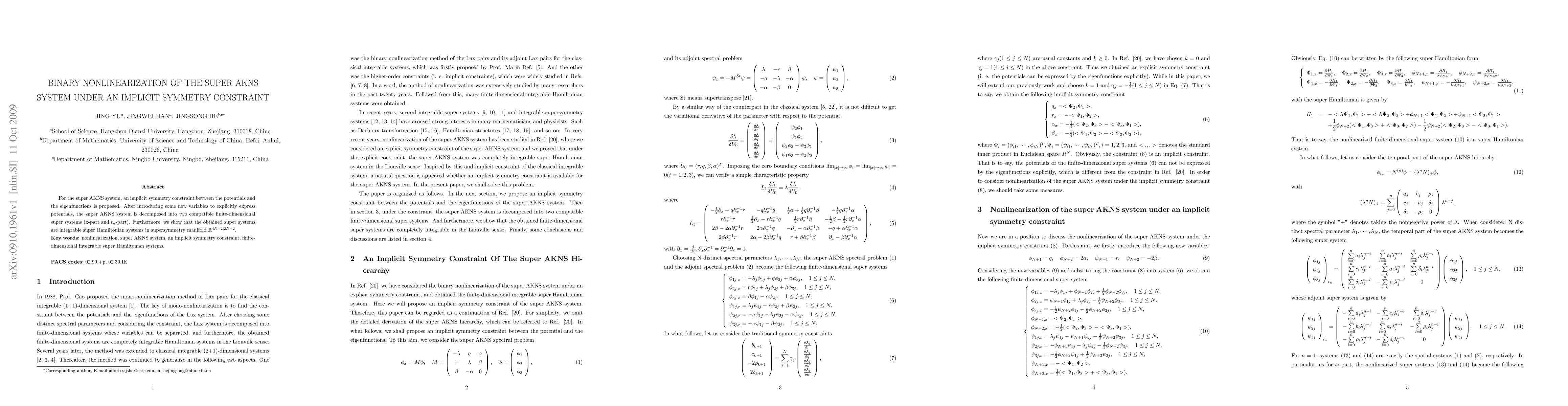 This paper proposes an implicit symmetry constraint for the super AKNS system, transforming it into two integrable finite-dimensional super Hamiltonian systems. The decomposition is achieved through new variables and results in systems compatible within the supersymmetry manifold $\mathbb{R}^{4N+2|2N+2}$.