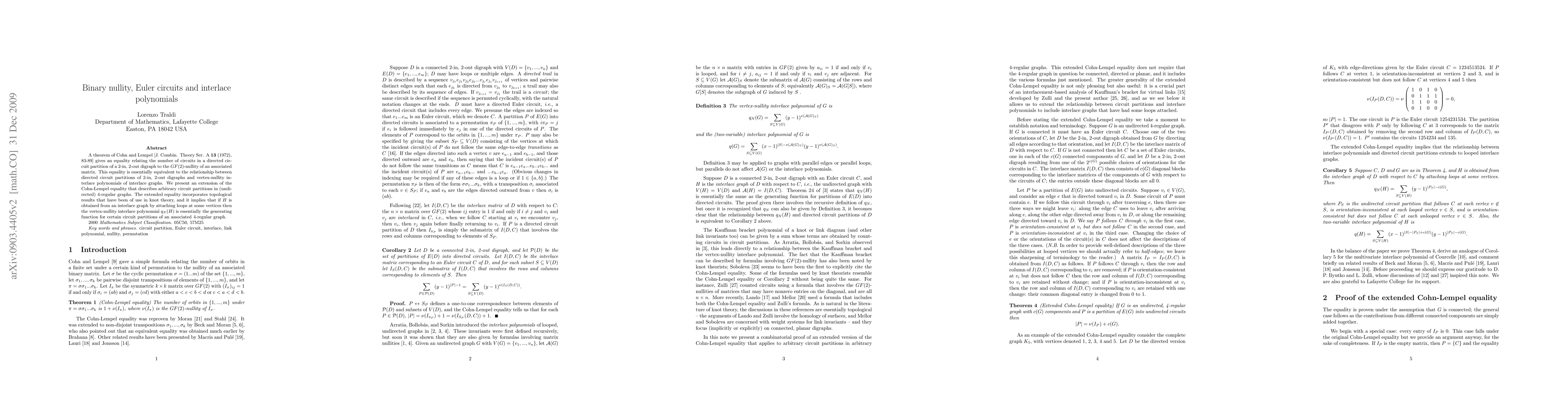 A theorem of Cohn and Lempel [J. Combin. Theory Ser. A 13 (1972), 83-89] gives an equality relating the number of circuits in a directed circuit partition of a 2-in, 2-out digraph to the GF(2)-nullity of an associated matrix. This equality is essentially equivalent to the relationship between directed circuit partitions of 2-in, 2-out digraphs and vertex-nullity interlace polynomials of interlace graphs. We present an extension of the Cohn-Lempel equality that describes arbitrary circuit partitions in (undirected) 4-regular graphs. The extended equality incorporates topological results that have been of use in knot theory, and it implies that if H is obtained from an interlace graph by attaching loops at some vertices then the vertex-nullity interlace polynomial $q_{N}(H)$ is essentially the generating function for certain circuit partitions of an associated 4-regular graph.