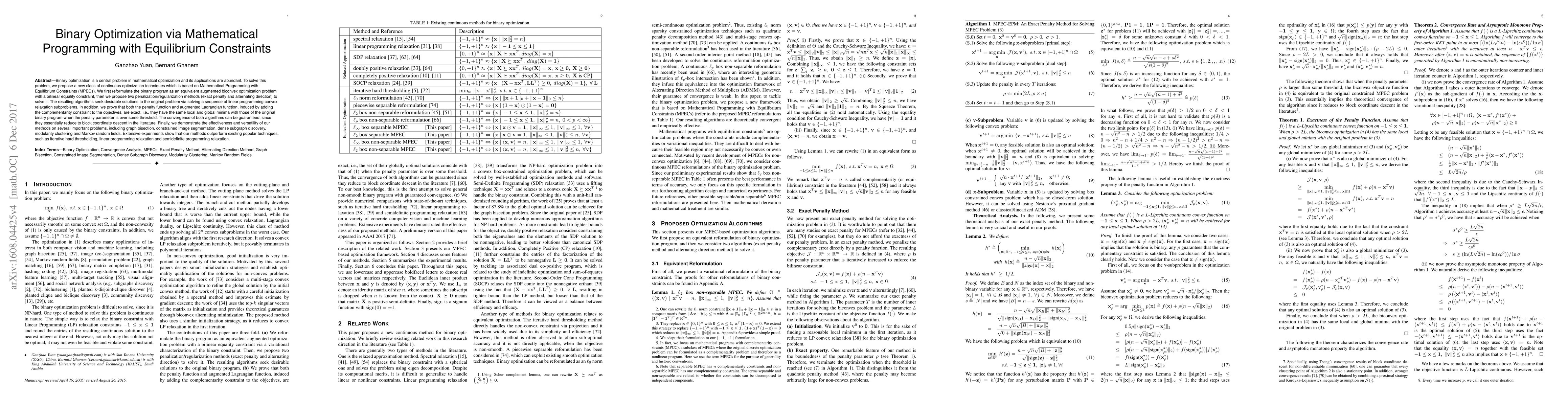 This paper proposes a new continuous optimization technique based on Mathematical Programming with Equilibrium Constraints (MPECs) to solve binary optimization problems. It reformulates the binary program into an augmented biconvex problem and uses exact penalty and alternating direction methods to solve it, demonstrating superior performance over existing techniques in various applications.