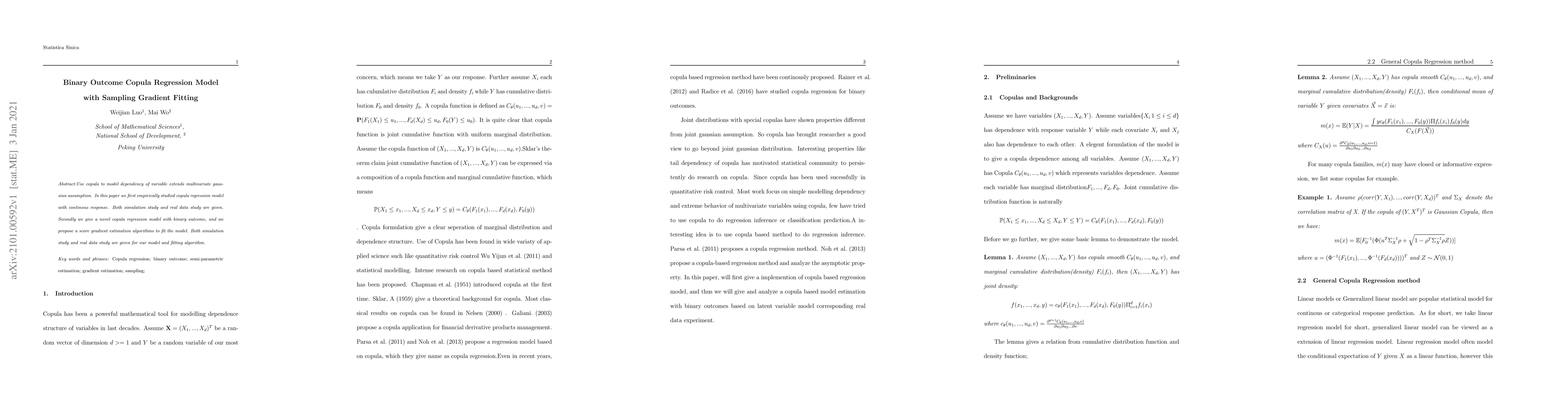 Use copula to model dependency of variable extends multivariate gaussian assumption. In this paper we first empirically studied copula regression model with continous response. Both simulation study and real data study are given. Secondly we give a novel copula regression model with binary outcome, and we propose a score gradient estimation algorithms to fit the model. Both simulation study and real data study are given for our model and fitting algorithm.