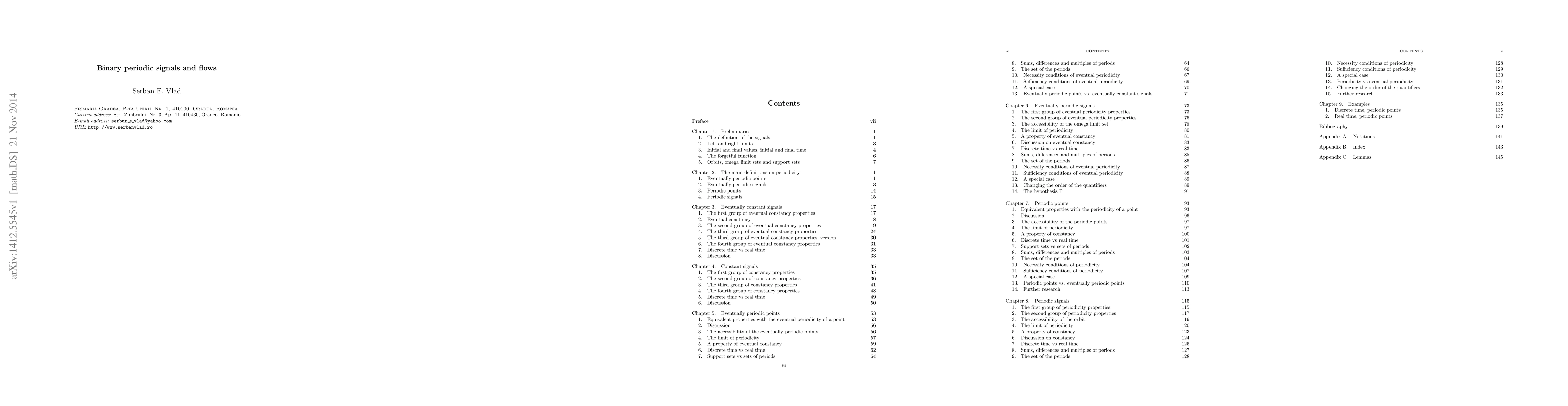 This research paper explores binary periodic signals and flows, a concept from switching theory that studies autonomous deterministic regular asynchronous systems with unique state functions and independent coordinate iterations. It provides key findings on the characterization of eventually constant, constant, eventually periodic, and periodic signals, as well as constructions for altering periodicity properties in these systems.