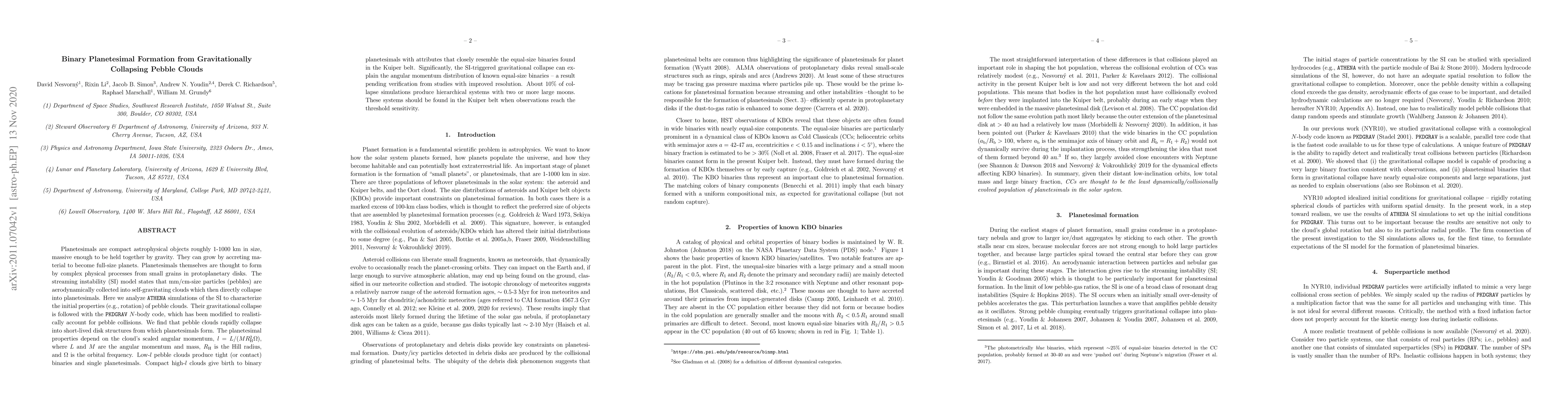 This paper investigates the formation of binary planetesimals from gravitationally collapsing pebble clouds through ATHENA simulations and PKDGRAV N-body code. It finds that low angular momentum clouds form tight binaries or single planetesimals, while high angular momentum clouds produce binary planetesimals similar to those in the Kuiper belt.