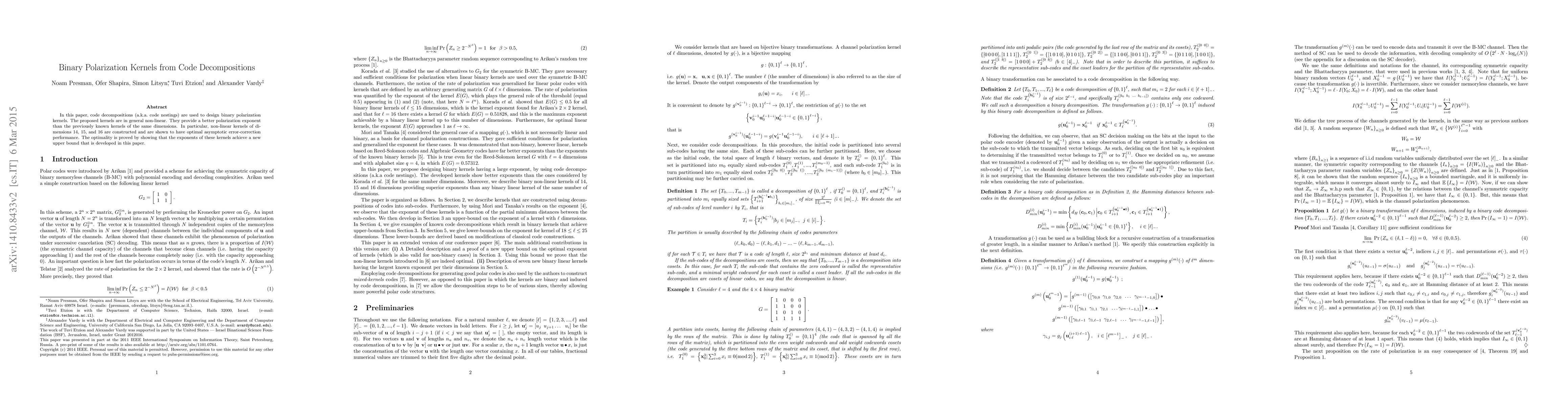This paper designs binary polarization kernels using code decompositions, achieving better polarization exponents than previous kernels. The new non-linear kernels of dimensions 14, 15, and 16 demonstrate optimal asymptotic error-correction performance, proven by establishing a new upper bound for their exponents.