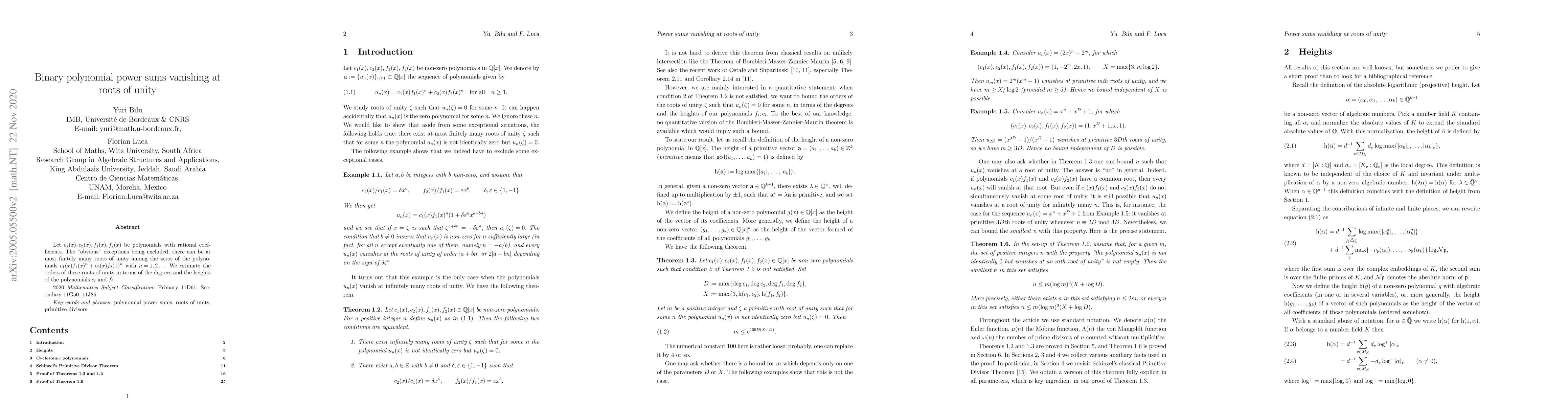 This paper investigates the number of roots of unity among the zeros of polynomials of the form $c_1(x)f_1(x)^n + c_2(x)f_2(x)^n$ for $n=1,2,\ldots$, showing that such roots are finite and estimates their orders based on the degrees and heights of the polynomials involved.