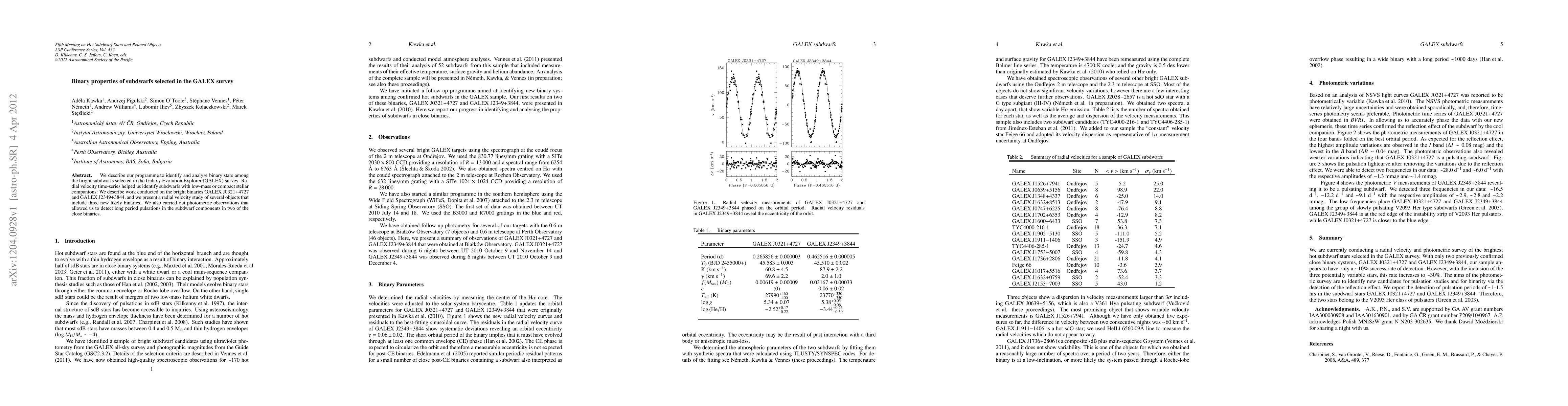 We describe our programme to identify and analyse binary stars among the bright subdwarfs selected in the Galaxy Evolution Explorer (GALEX) survey. Radial velocity time-series helped us identify subdwarfs with low-mass or compact stellar companions: We describe work conducted on the bright binaries GALEX J0321+4727 and GALEX J2349+3844, and we present a radial velocity study of several objects that include three new likely binaries. We also carried out photometric observations that allowed us to detect long period pulsations in the subdwarf components in two of the close binaries.